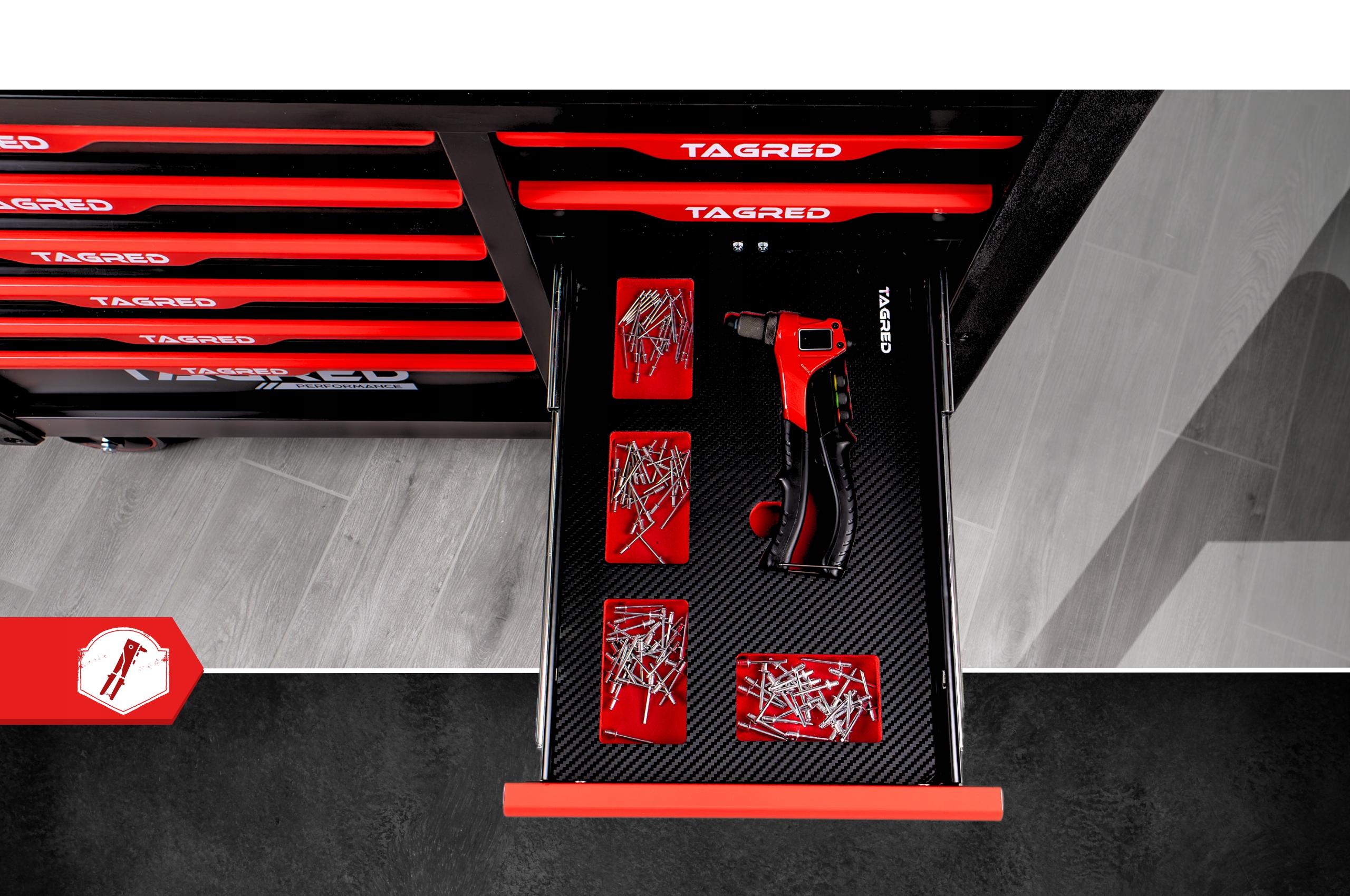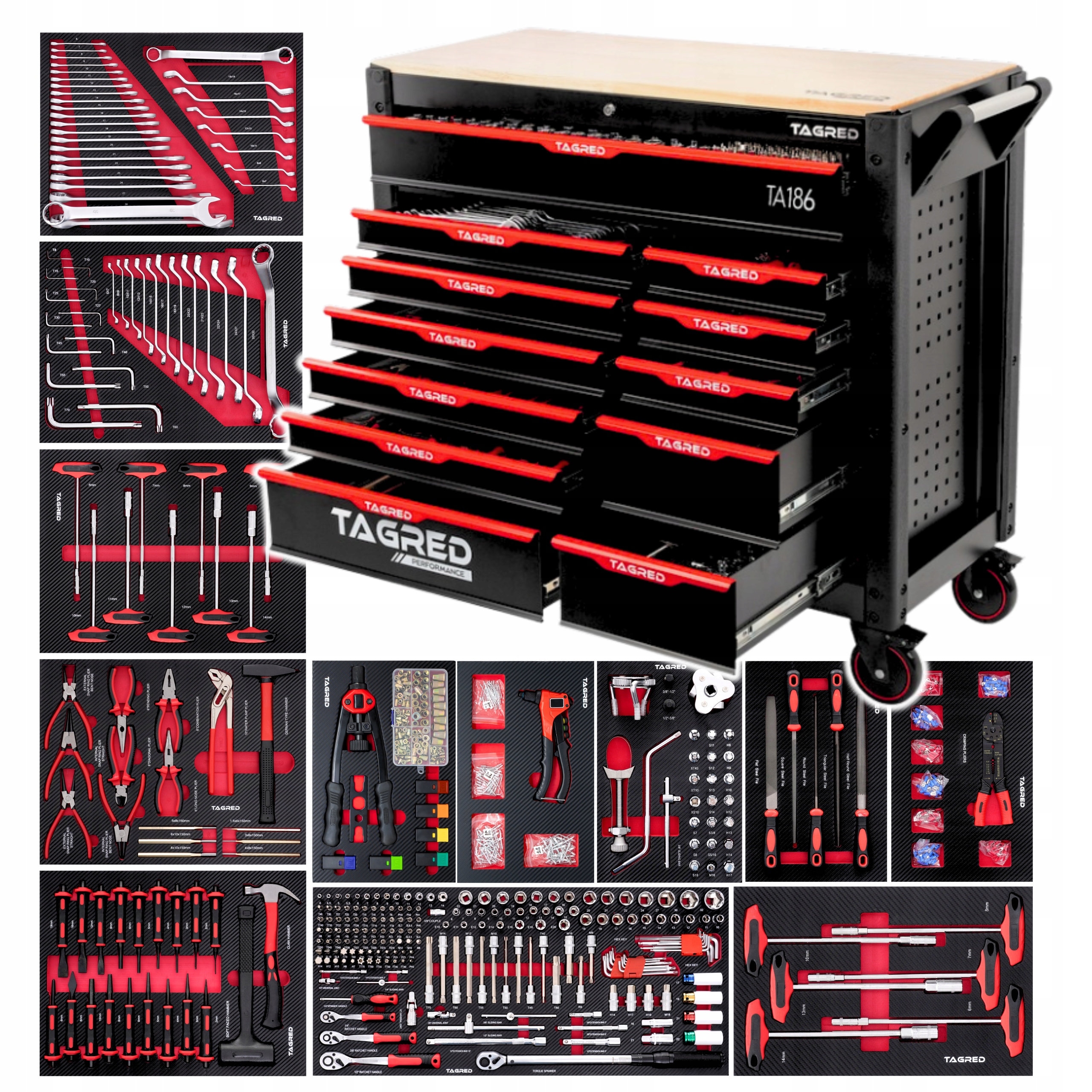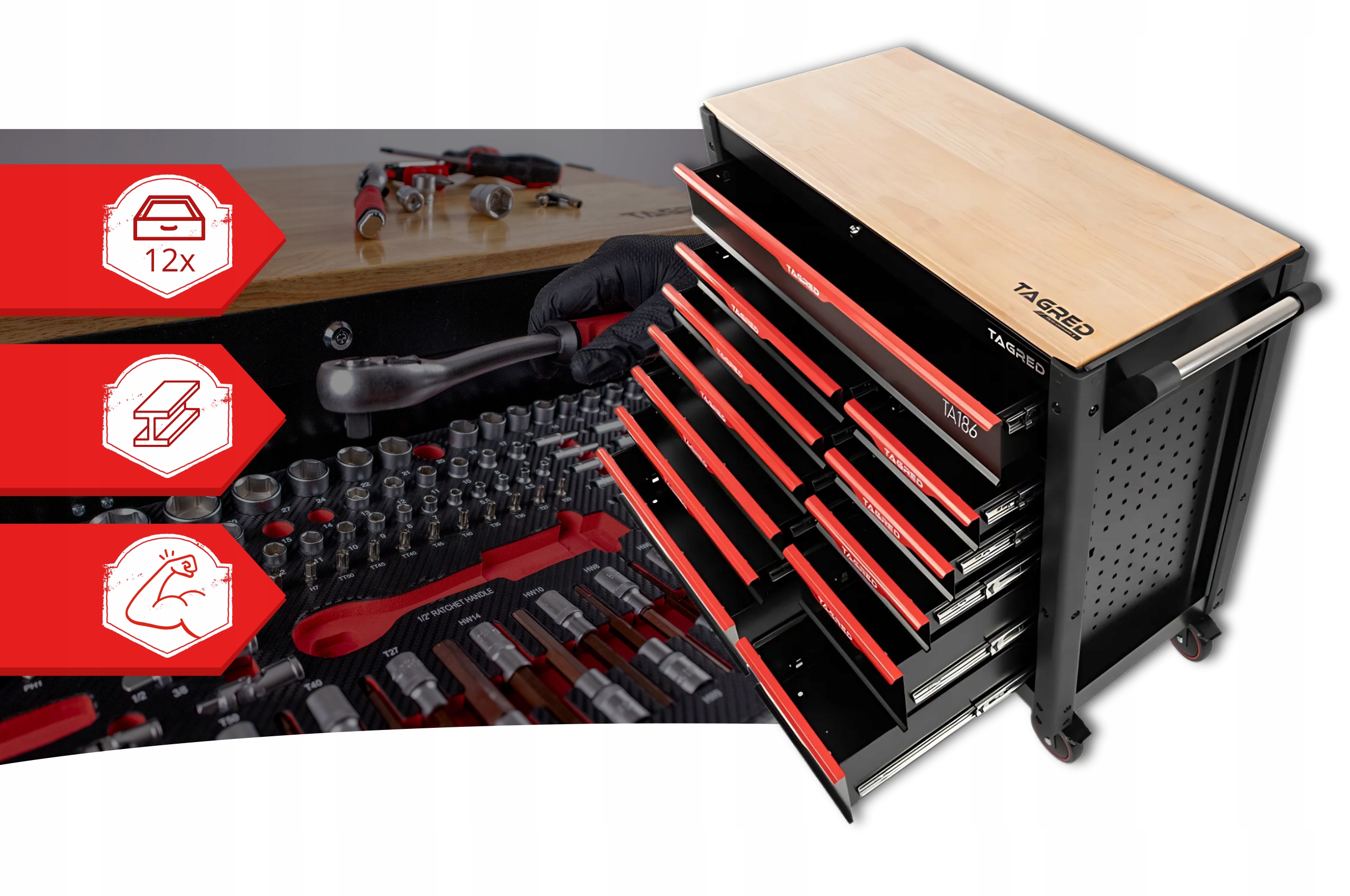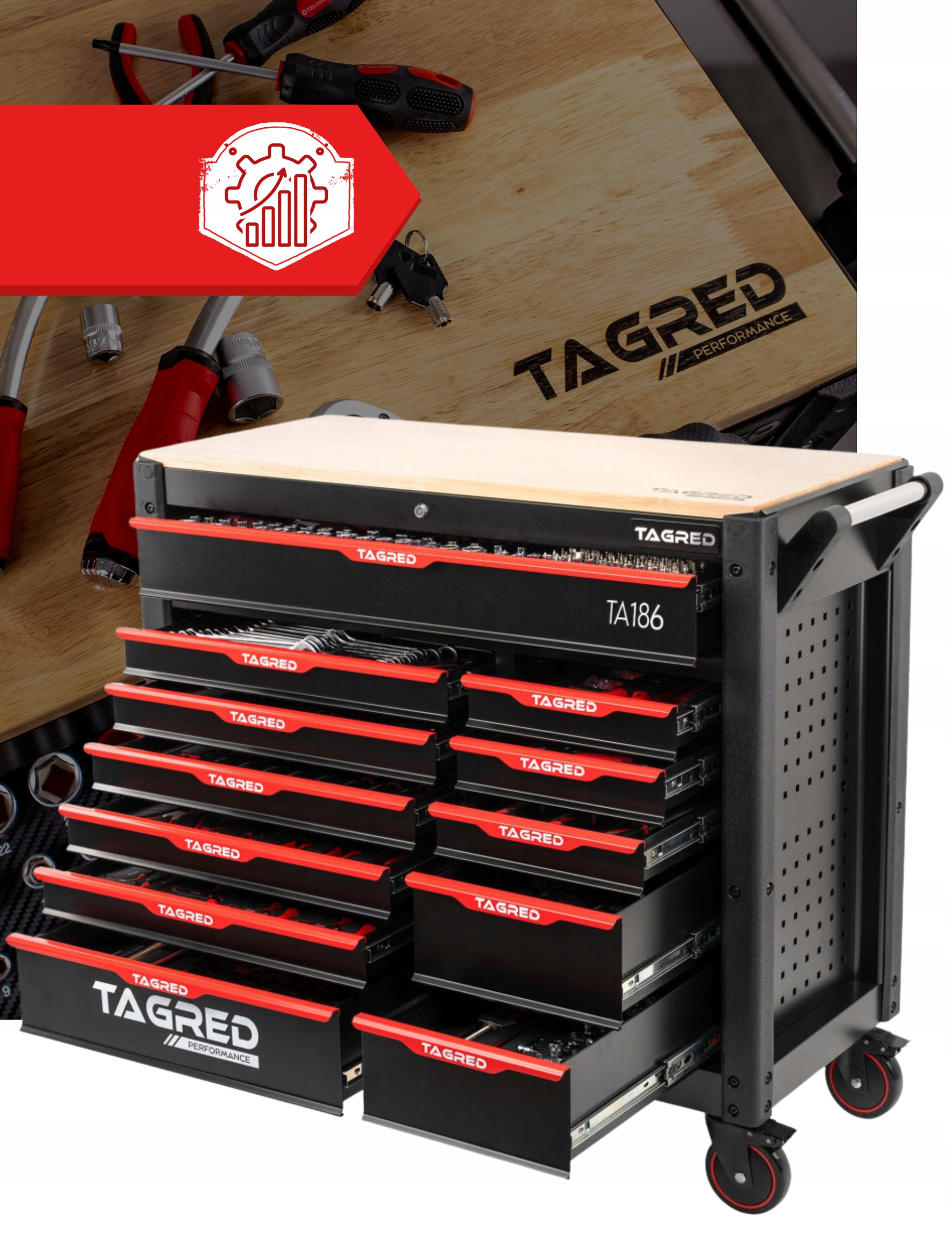 Wózek warsztatowy TA186 to wytrzymałość, funkcjonalność i wygoda. Wykonany ze stali 0,8 mm, zapewnia trwałość w każdych warunkach. 12 szuflad na łożyskach kulkowych z automatycznym domykaniem i centralnym zamkiem zabezpiecza narzędzia. Duże koła z hamulcem oraz ergonomiczny uchwyt ułatwiają transport. Bogate wyposażenie, perforowane ściany na uchwyty i wyściółka EVA chroniąca przed olejami to idealne rozwiązanie dla profesjonalistów i majsterkowiczów.