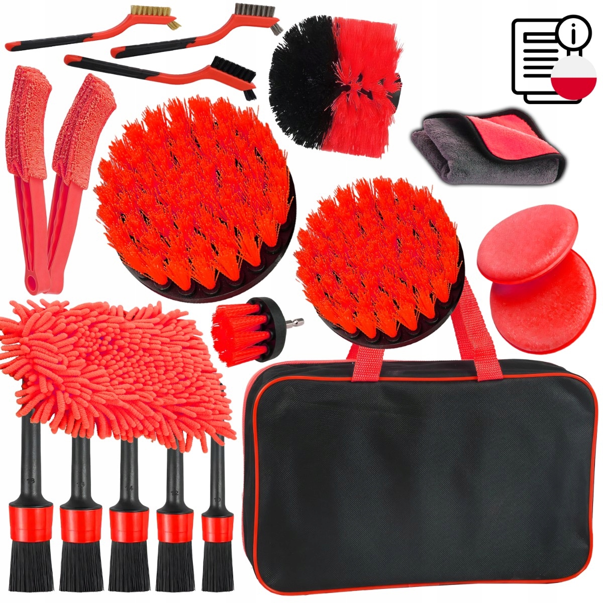 Dzięki szerokiemu zakresowi narzędzi, w tym szczotkom, pędzlom i gąbkom o różnych kształtach i rozmiarach, zestaw umożliwia precyzyjne czyszczenie zarówno wnętrza, jak i zewnętrznych części samochodu.