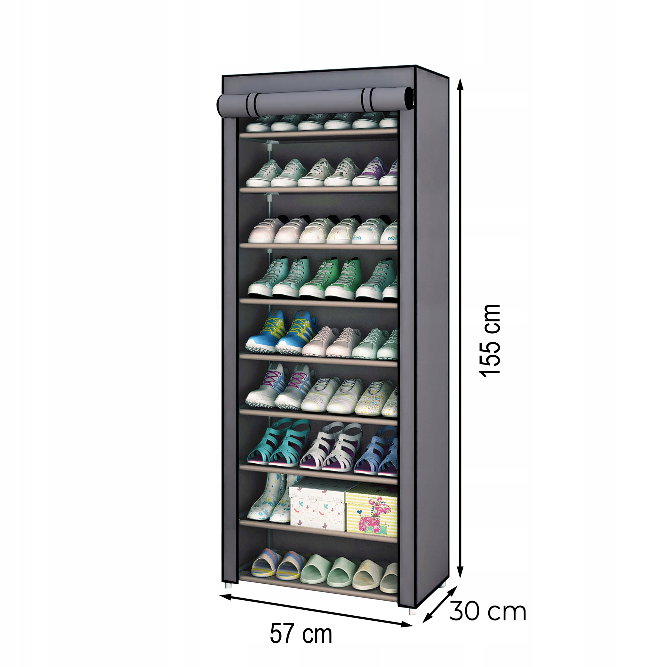 ✔️ Kompaktowy i pojemny design – regał na buty o wymiarach 30 x 57 x 155 cm, wyposażony w 9 półek, pozwala na przechowanie aż 27 par obuwia, idealnie pasując do wąskich przestrzeni.