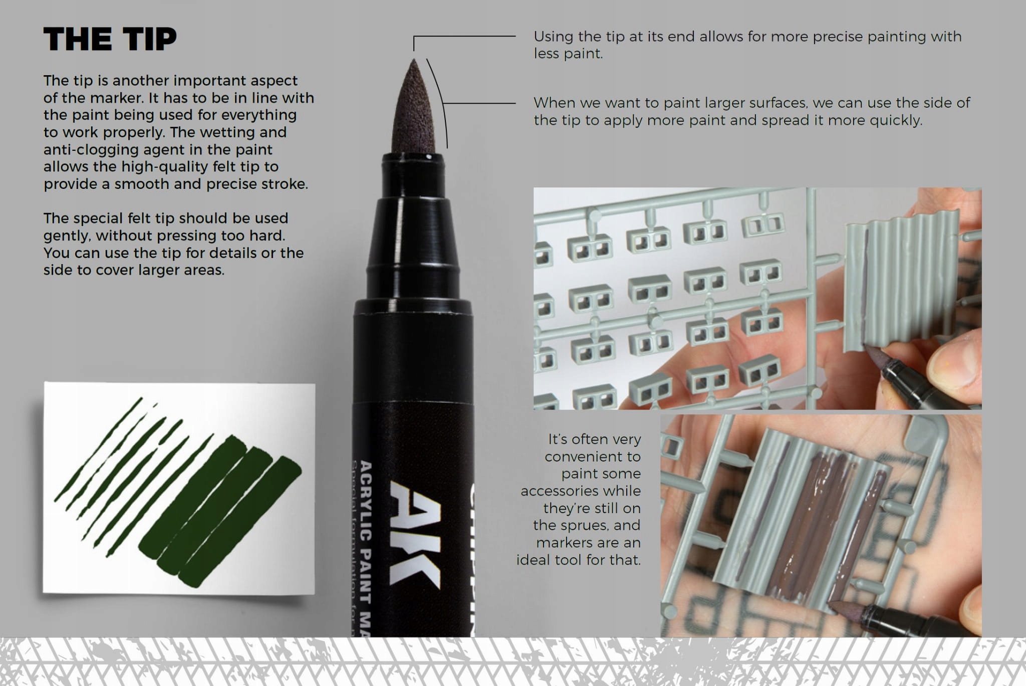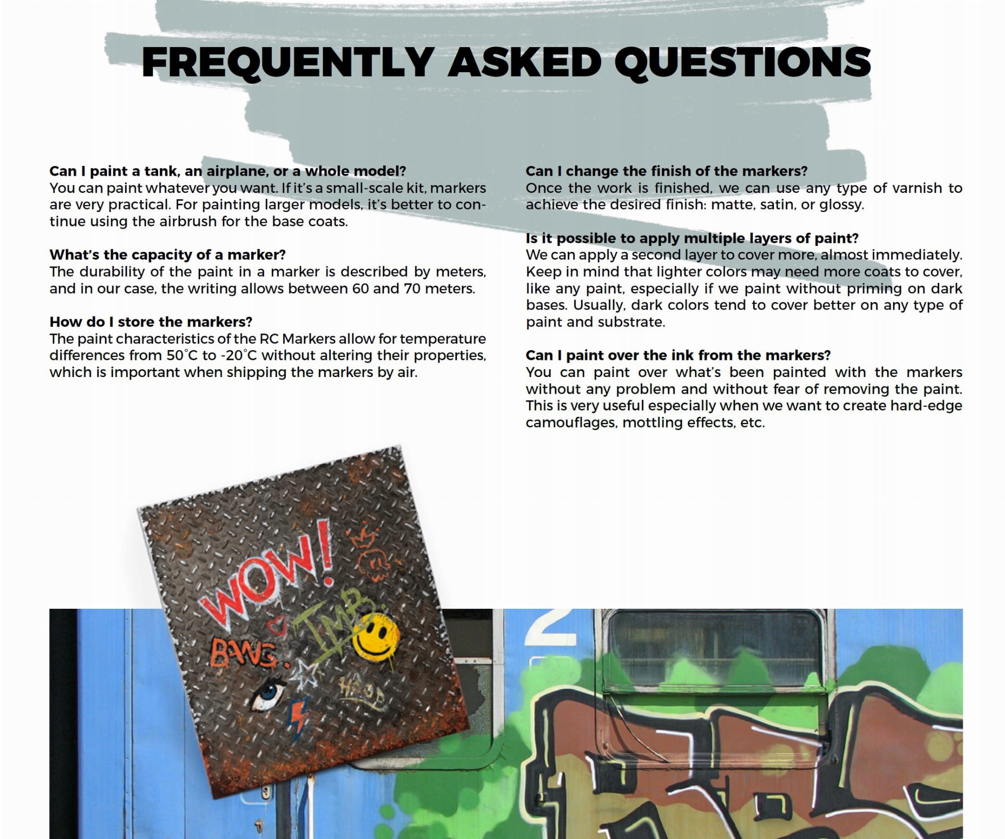 (Wykończenie markerów jest matowe, ale niektóre kolory ze względu na charakter pigmentów, mogą być nieco satynowe. Niezależnie od preferowanego wykończenia, czy jest ono matowe, satynowe czy błyszczące, markery można pokryć dowolnym rodzajem lakieru bez obawy o uszkodzenie farby).