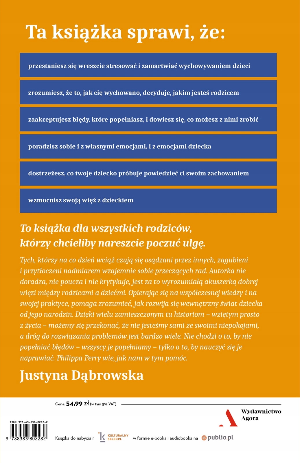 Trudno być rodzicem w naszych czasach. Toniemy w zalewie, często sprzecznych ze sobą, rad. Karne jeżyki, punkty dodatnie i ujemne, komunikaty ja, rodzicielstwo bliskości... Philippa Perry, brytyjska psychoterapeutka z ponad 20-letnim stażem, a także mama, pokazuje w swojej książce zupełnie inną perspektywę. Proponuje powrót do tego, co w rodzicielstwie kluczowe, a więc do relacji rodzic-dziecko. Inaczej: mały człowiek – duży człowiek. Z takim spojrzeniem, bez użycia skomplikowanych technik, rozwiązywanie tzw. problemów wychowawczych staje się prostsze. I w ogóle jakoś lżej się robi na strapionym matczynym czy ojcowskim sercu.