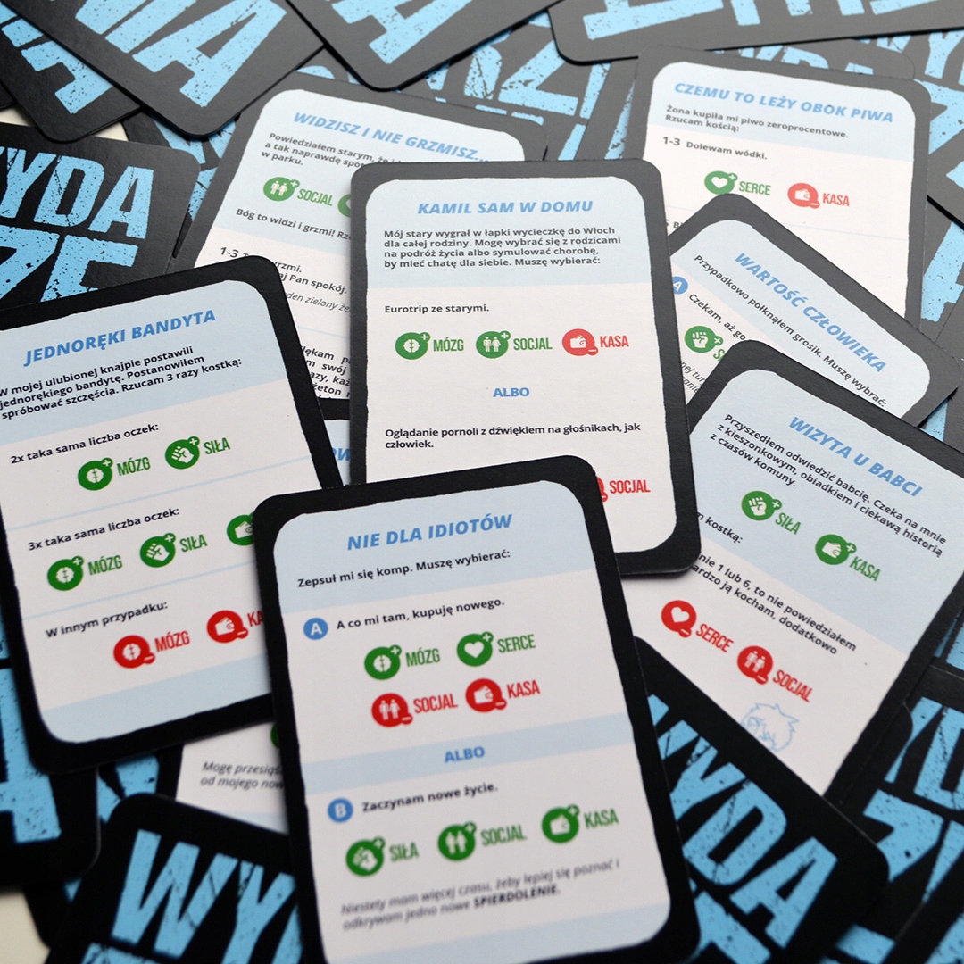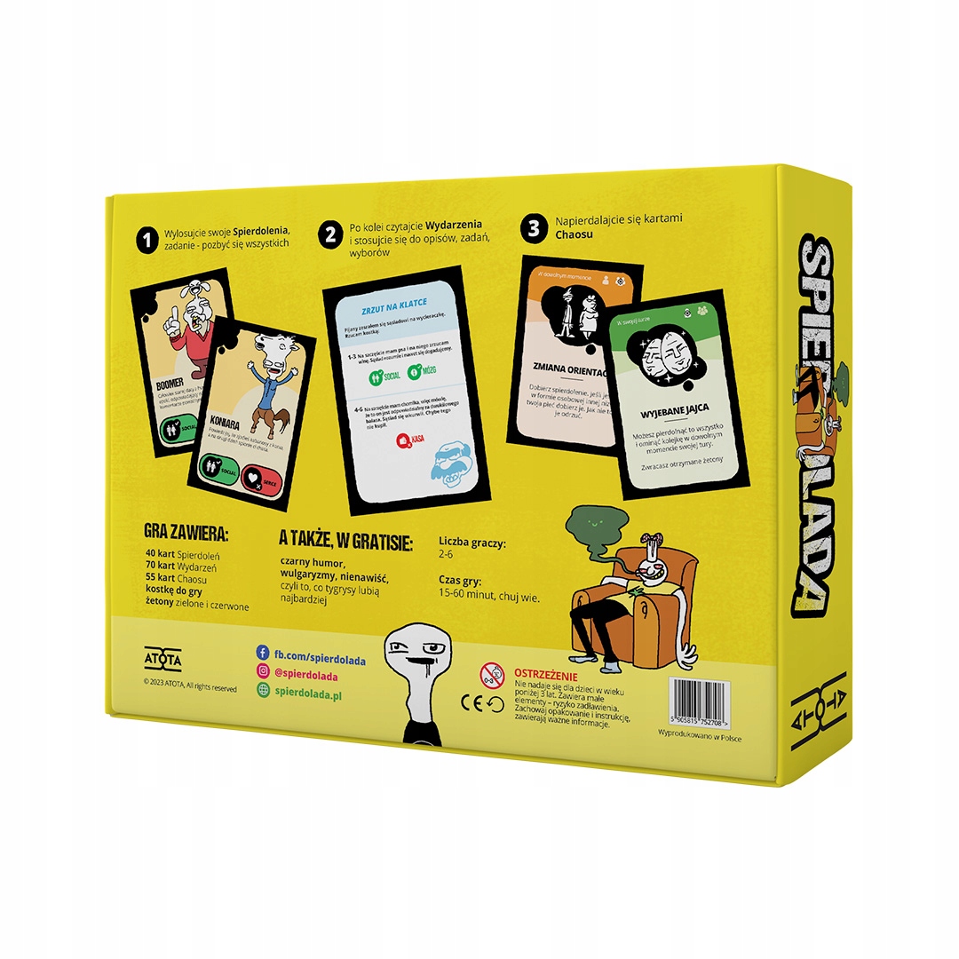 Spie*dolada to idealny prezent na 18 urodziny, wieczór kawalerski lub na spontaniczne spotkania ze swoimi ziomkami - przegrywami. Zasady są proste i zrozumiałe już od pierwszej gry. Karty Chaosu zweryfikują zdolności strategiczne twoich znajomych, a karty Wydarzeń upewnią się, że nikt nie przyszedł na imprezę z kijem w d..pie.