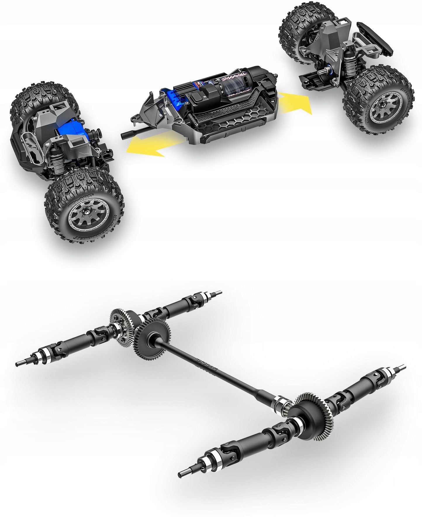 Mini Maxx został zaprojektowany zgodnie z wyższymi standardami w zakresie komponentów układu napędowego 4X4 w skali 1/10. Duże dyferencjały ze stalowymi kołami zębatymi, solidne 32 stopniowe koła zębate i wytrzymałe wały napędowe z przegubami w kształcie litery U znacznie przekraczają wymagania dotyczące wytrzymałości i długiej żywotności.