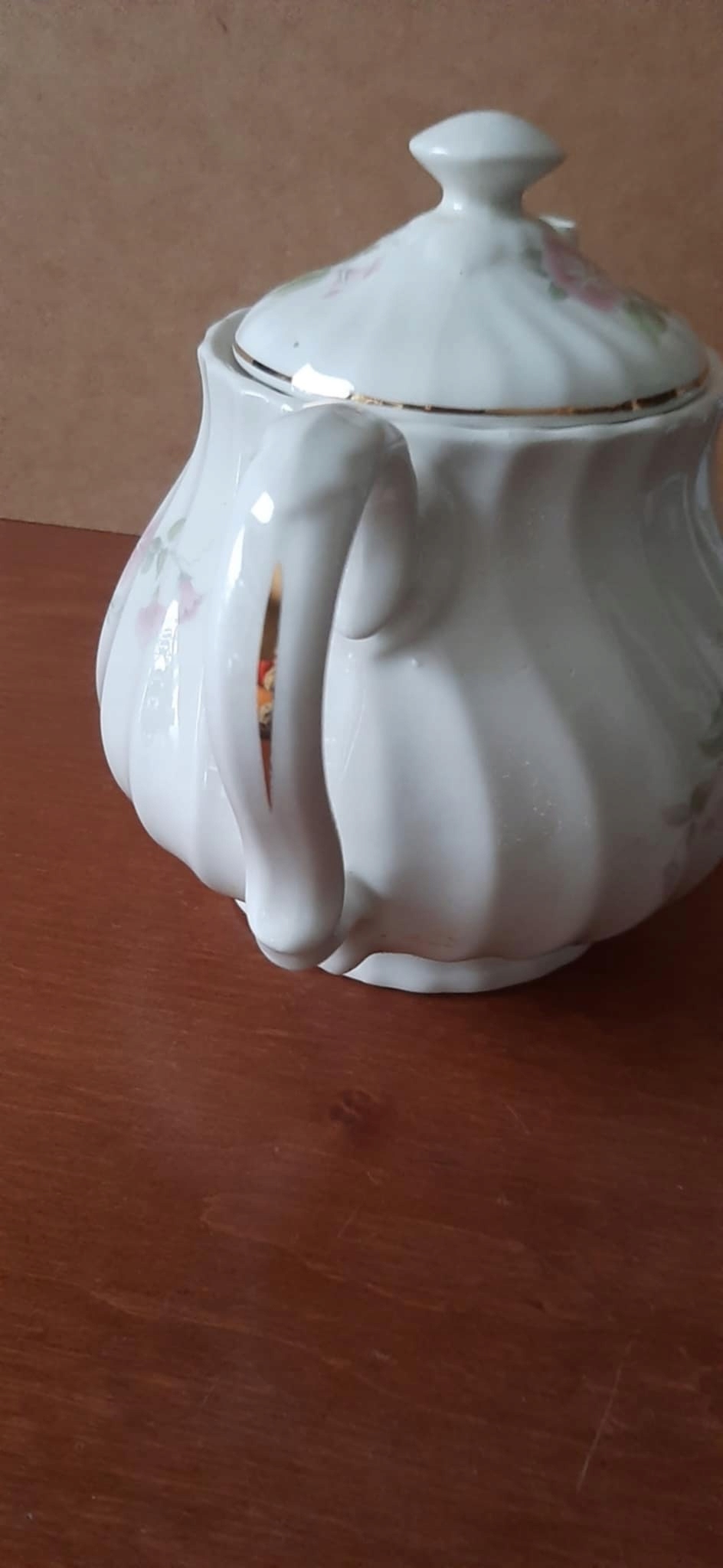 Mam na sprzedaż biały porcelanowy imbryk / czajnik do parzenia herbaty w kwiaty.