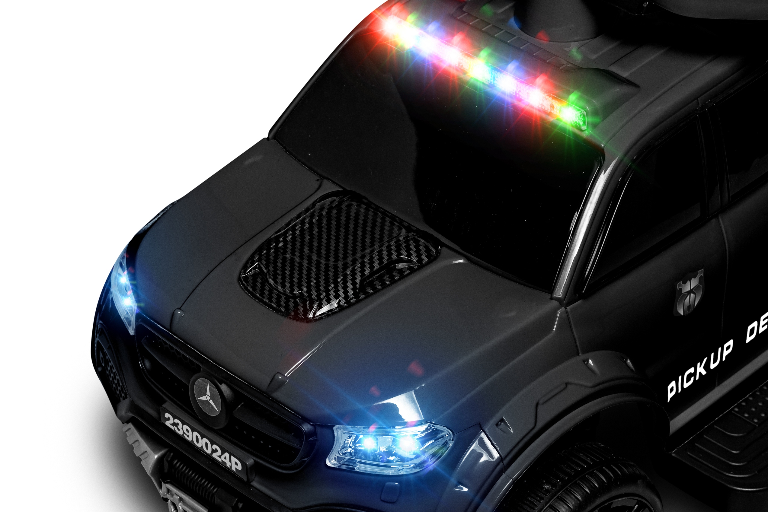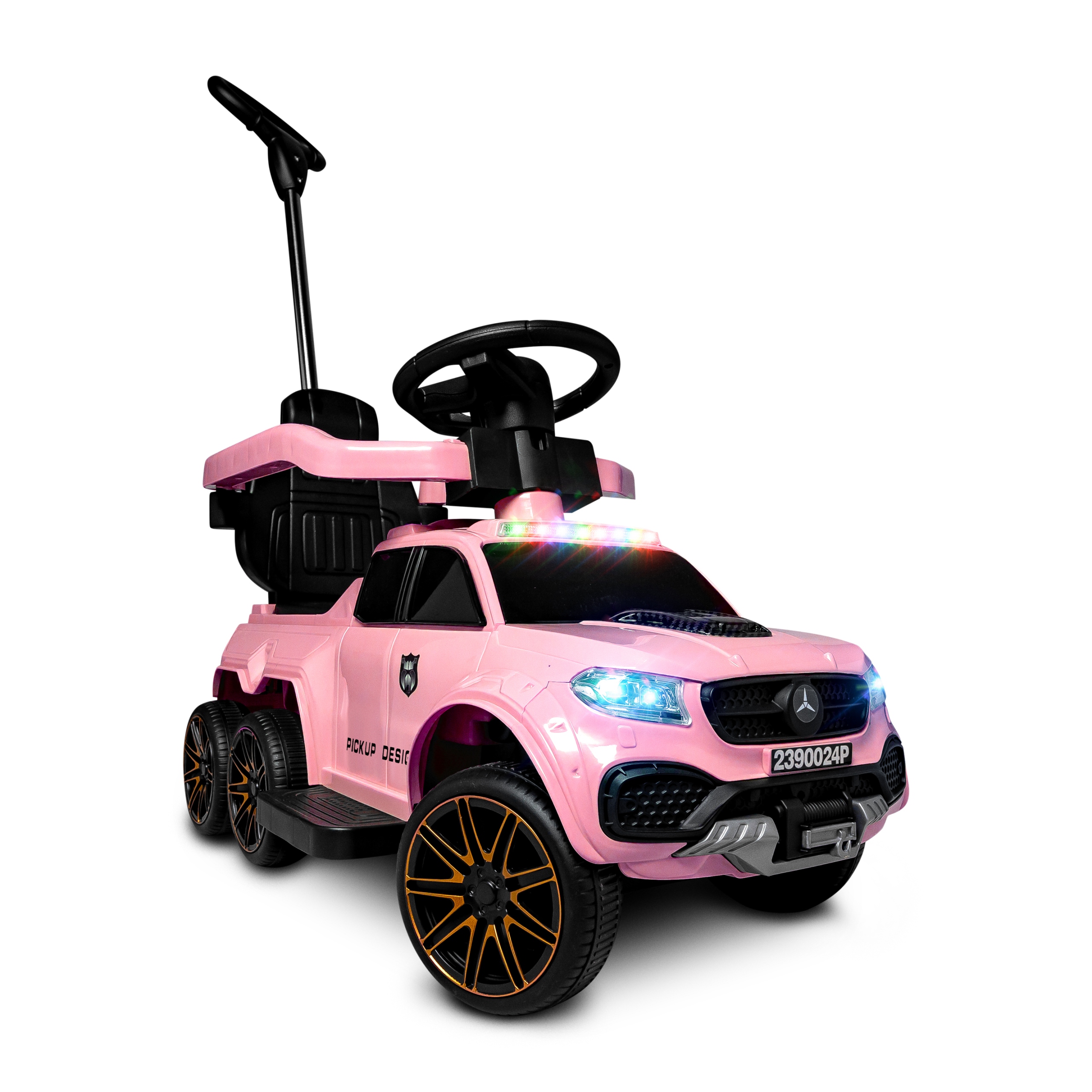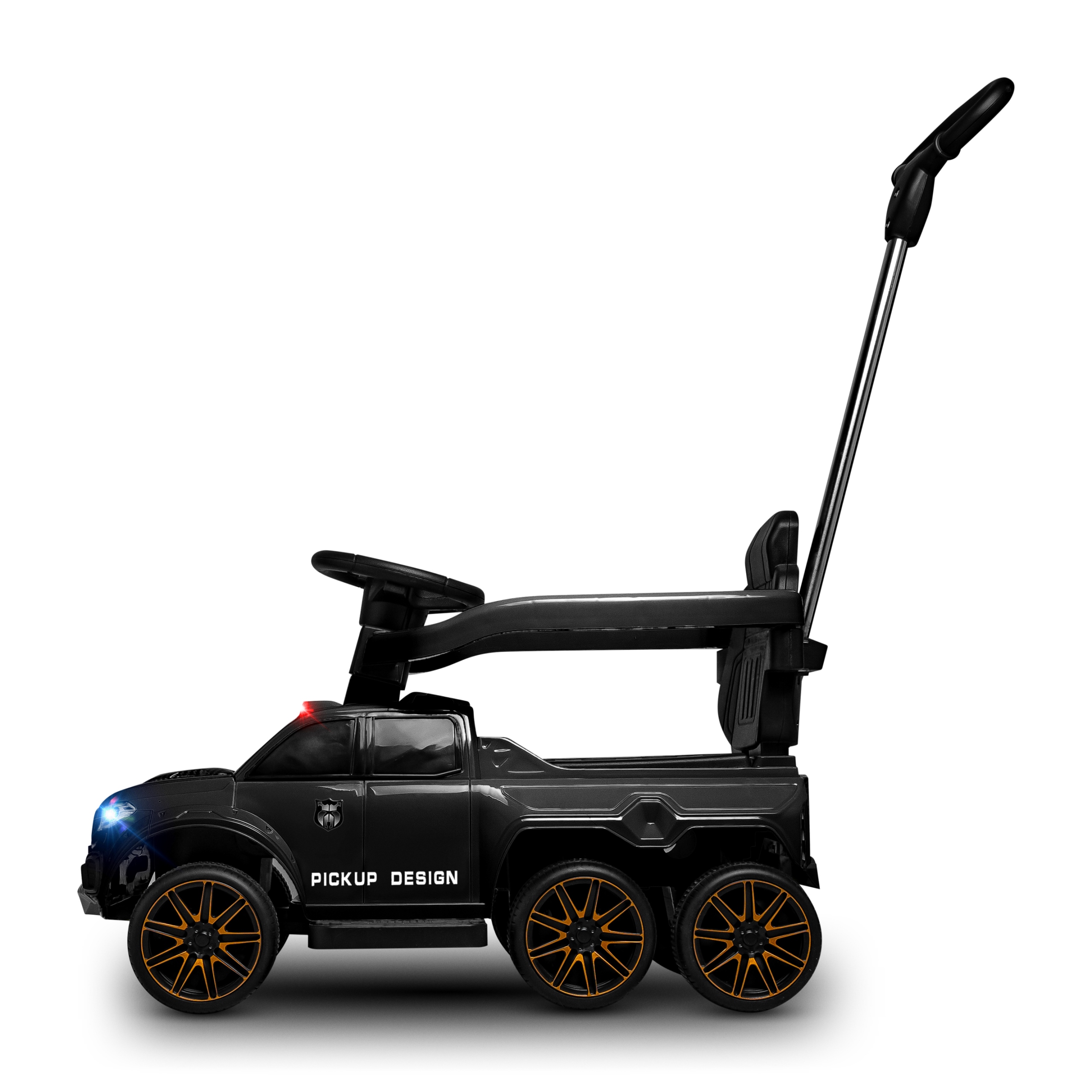 Bardzo duży jeździk 6 kołowy wyposażony w oświetlne LED oraz efekty dźwiękowe na panelu muzycznym. Wygodna i trwała stalowa rączka prowadząca i skrętna dla rodzica. Nowoczesne wzornictwo PICKUP DESIGN