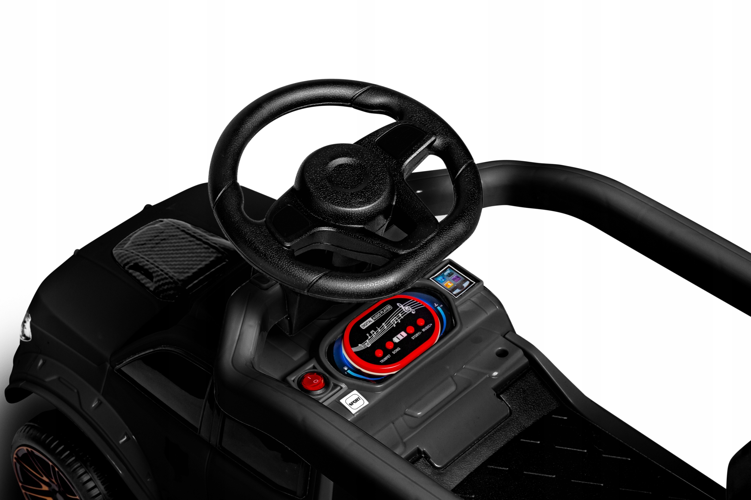 Jeździk posiada zamontowany panel muzyczny pod kierownicą. Panel ma wbudowane melodyjki i efekty dźwiękowe m.in syrena, które dodatkowo urozmaicają zabawę, zapewniając maluchom wiele radości podczas jazdy.