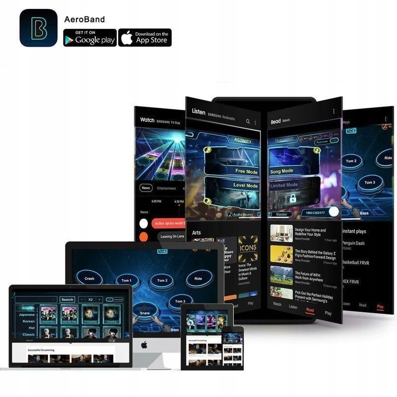 Proste instrukcje wideo czynią z Ciebie profesjonalnego perkusistę w ciągu kilku godzin. Tryb piosenki Powiedz nie nudnym kursom gry na perkusji. Ćwicz z tysiącami piosenek w aplikacji Aeroband. Prosta i przyjemna gra w aplikacji, która sprawia, że ćwiczenia są czystą przyjemnością. W zależności od preferencji możesz wybrać tryb klasyczny z sześcioma lub siedmioma klawiszami lub tryb nożny.