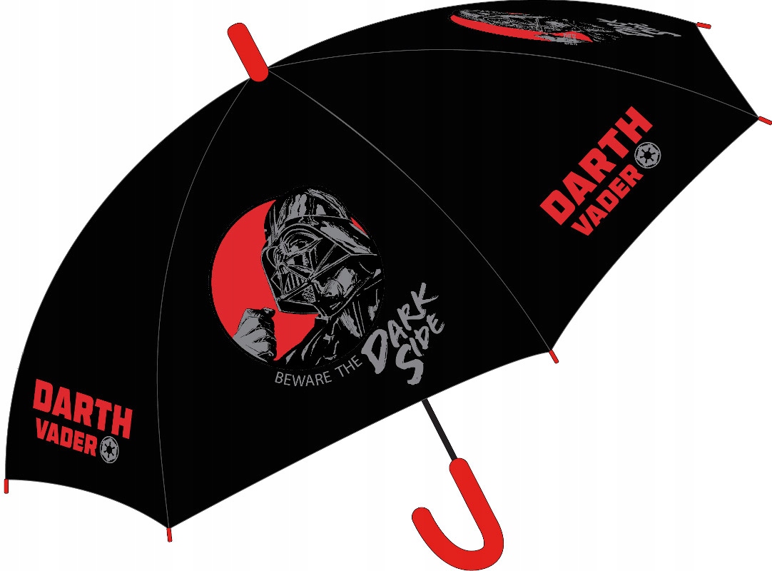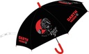 Rozkładany automatycznie. Na metalowym stelażu z plastikową rączką oraz paskiem na zatrzask do spięcia złożonego parasola.