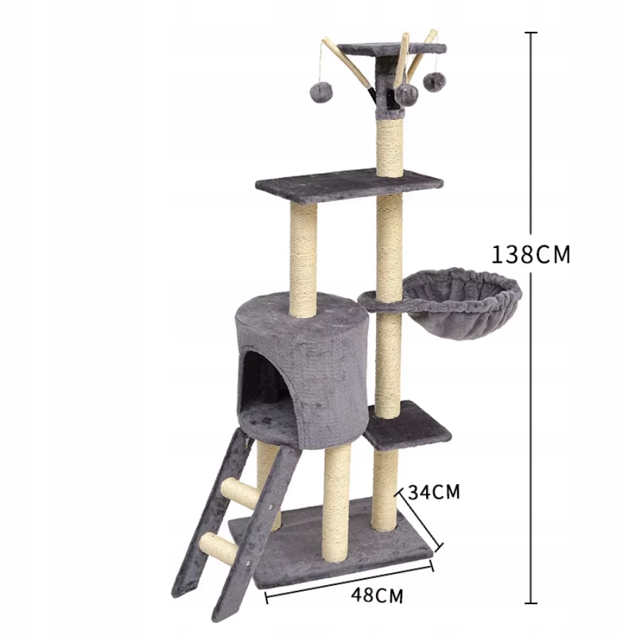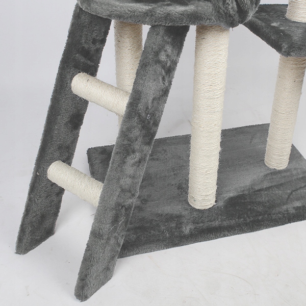 Domek, platformy oraz legowisko pokryte są miękkim pluszem, który jest wygodny dla kotów podczas leżenia i odpoczywania. Słupki do drapania pokryte są sizalem, który jest bardzo twardym materiałem, przez co trudno wydrapać go do końca. Świetnie nadaje się on do zaspokojania naturalnej potrzeby drapania, pozwalającej utrzymać pazury w dobrym stanie i przyczyniającej się do ich pięlegnacji. Dzięki temu kot nie będzie musiał więcej szukać innych powierzchni do drapania takich jak meble czy tkaniny.