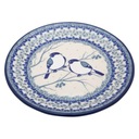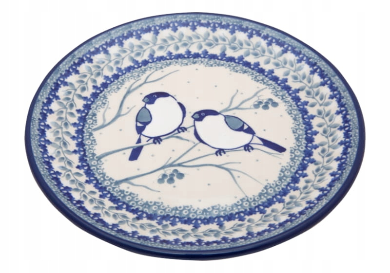 Ceramika Bolesławiec - HANDMADE. Wzór Unikatowy - ptak gil. Dwa ptaki w kolorach zimy. Wykończenie obrzeża w kolorze granatowym.