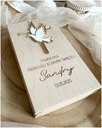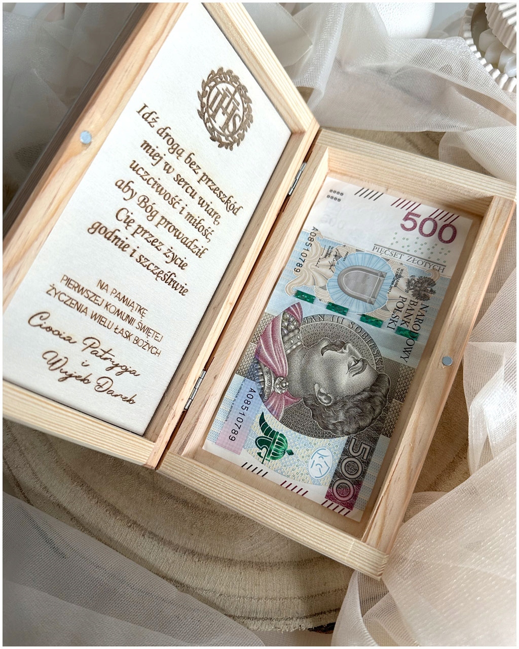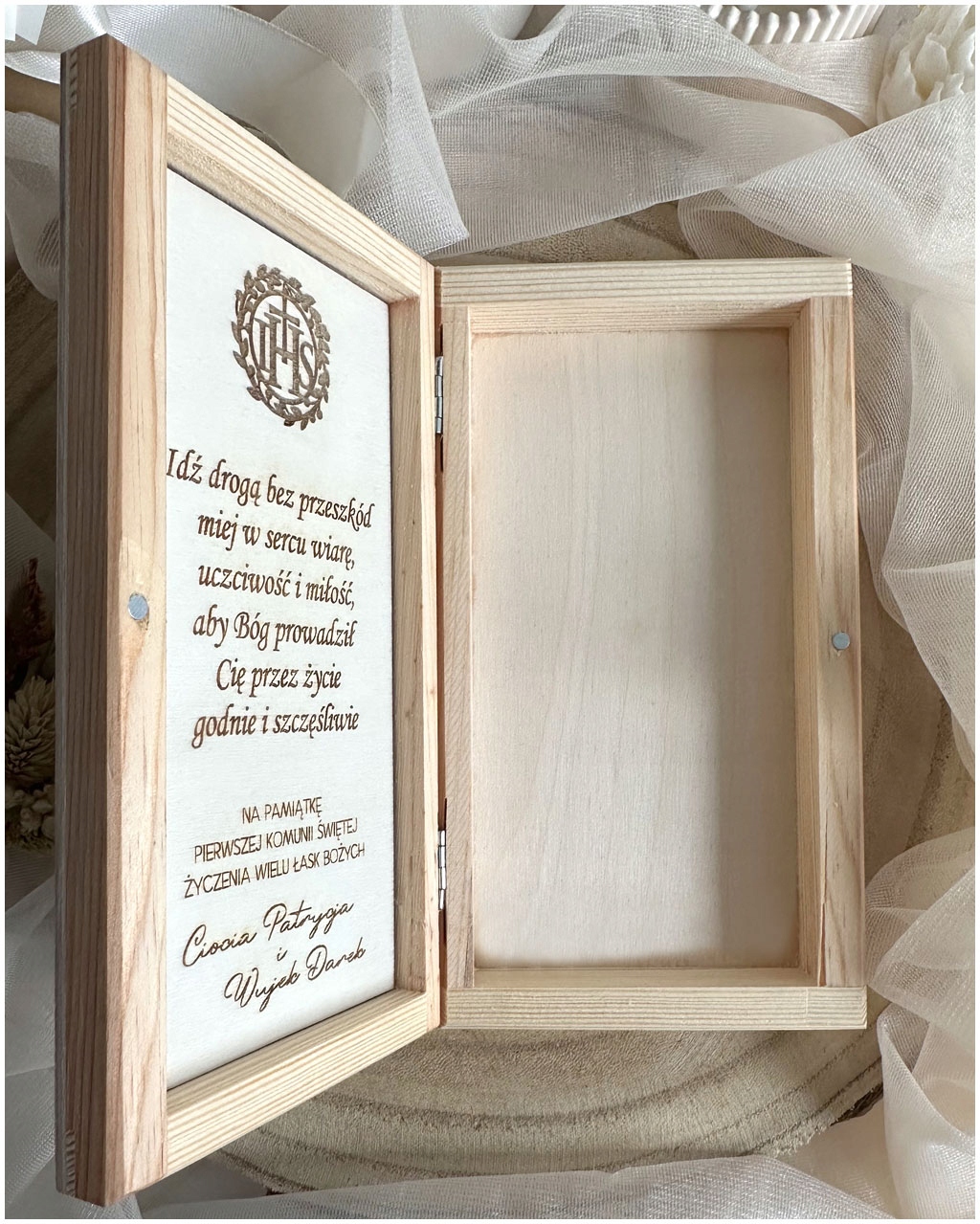 W otwieranym pudełeczku znajduje się kartka z personalizowanymi życzeniami do którego dodatkowo możesz włożyć biżuterię, pamiątkę Pierwszej Komunii lub pieniądze.