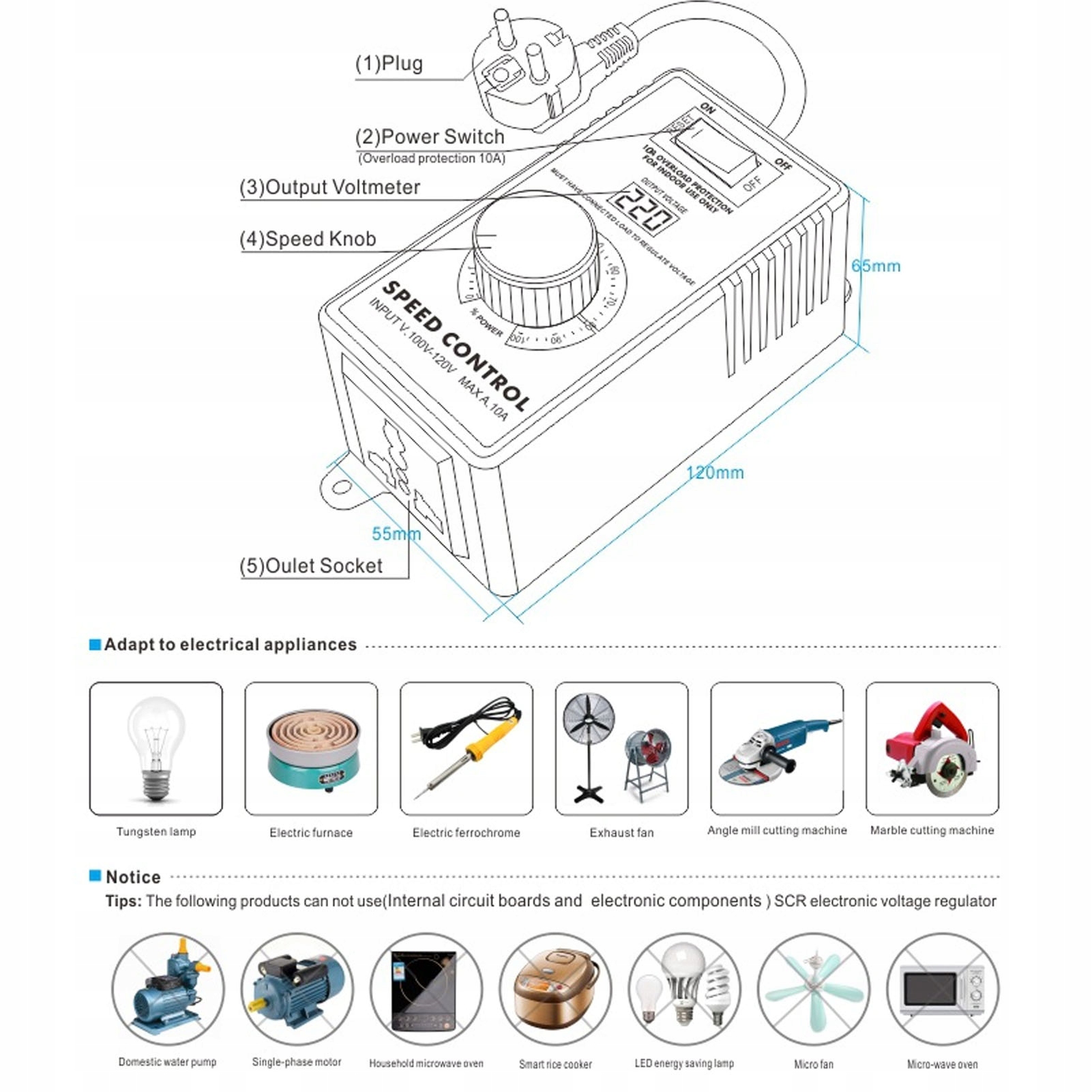 1. Zastosowanie szerokości: Ten kontroler prędkości może dostosować prędkość, temperaturę, napięcie i światło, odpowiednie dla wtyczek A i B, szeroko stosowane w wentylatorach wydechowych, żarówkach wolframowych, piecach elektrycznych, szlifietach kątowych, marmurowych maszynach, dmuchawach.