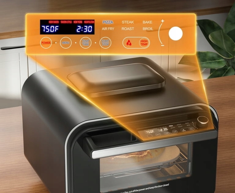 HOMEFAVOR 6-w-1 wielofunkcyjny elektryczny piec do pizzy, 1800 W blatowy piec do pizzy do użytku wewnątrz i na zewnątrz osiąga autentyczne, wysokiej jakości rezultaty przy temperaturach sięgających do 750°F (400°C). Idealny do pieczenia chrupiących neapolitańskich pizz, smażenia steków i opanowywania technik gotowania wymagających wyższych temperatur, zapewniając, że każde danie zostanie ugotowane bezbłędnie.