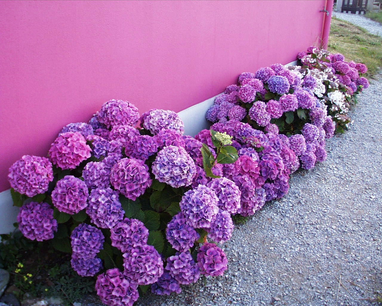Roślina o półkulistym, zwartym pokroju. Dorasta do 1,3 m wysokości i podobnej szerokości. Liście ciemnozielone, błyszczące. Kwiatostany kuliste, o średnicy 17-20 cm, różowo-fioletowe. W glebie zasadowej kwiaty różowo-czerwonawe, w kwaśnej w odcieniach lila i fioletu. Kwitnie od czerwca, aż do września, powtarza kwitnienie pod koniec lata.