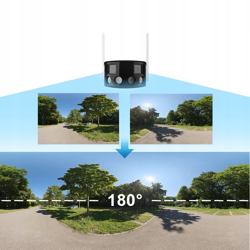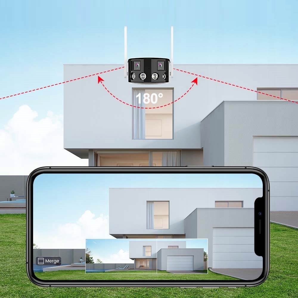 Panoramiczny obraz pozwoli Ci z łatwością ujrzeć wszystko co, co dzieje się wewnątrz lub na zewnątrz Twojego domu. Dzięki zastosowaniu dwóch kamer i połączeniu obrazu w jedną całość kąt widzenia wynosi aż 180 stopni.