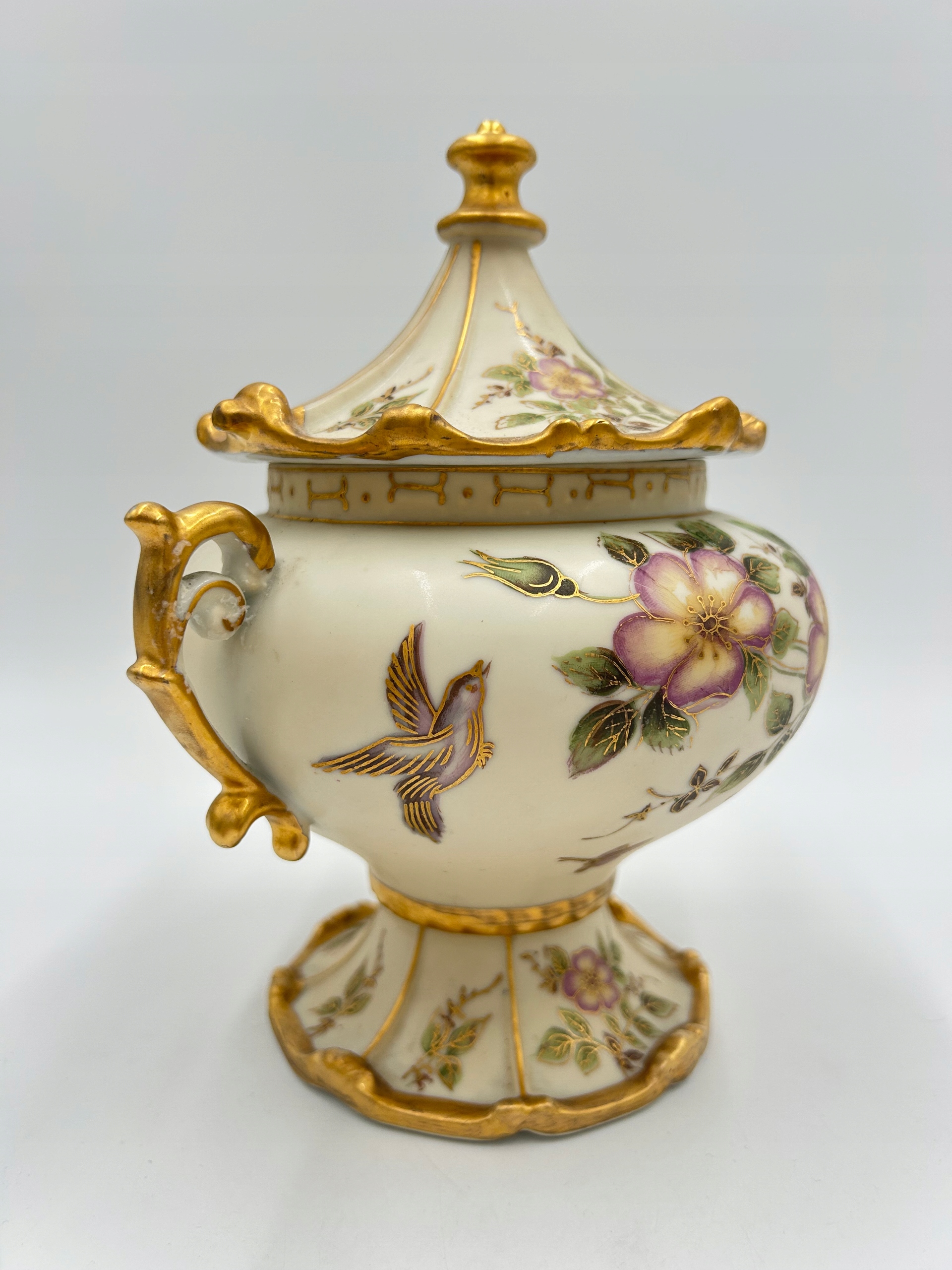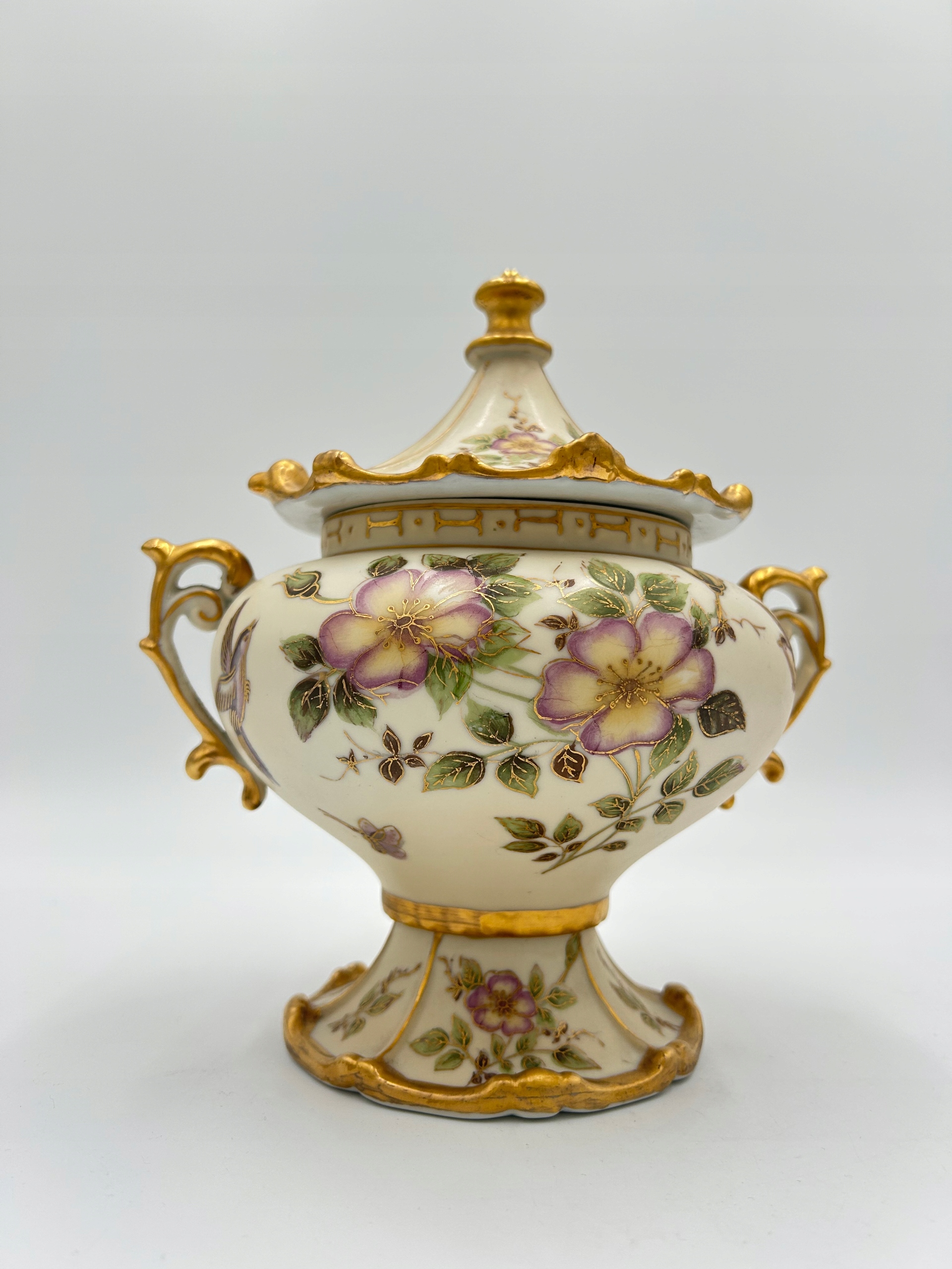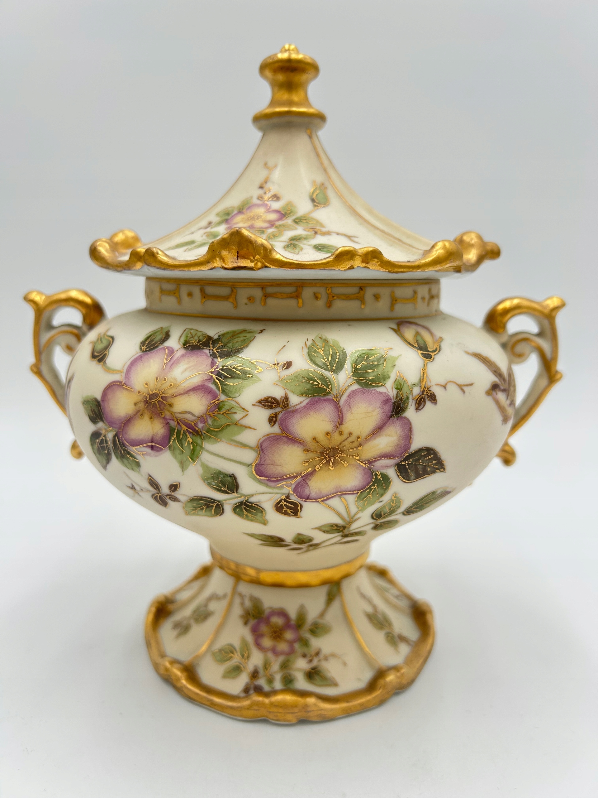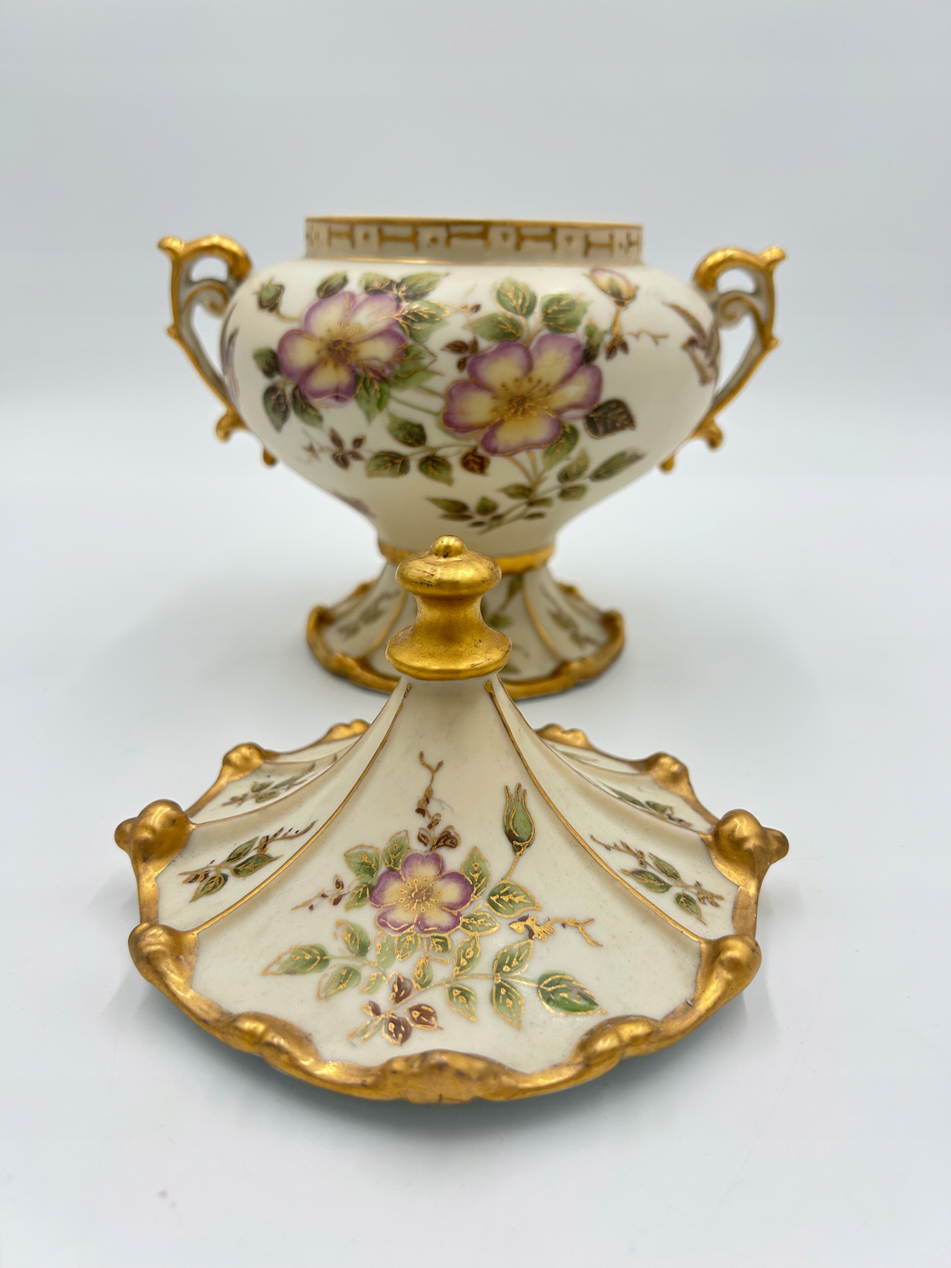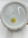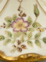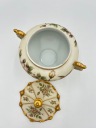 Przedmiotem sprzedaży jest elegancka porcelanowa bomboniera na nodze z pokrywą. Bomboniera w kolorze kości słoniowej, matowa, zdobiona motywem kwiatowym i dekoracyjnymi złoconymi brzegami. Piękny przedmiot dekoracyjny.