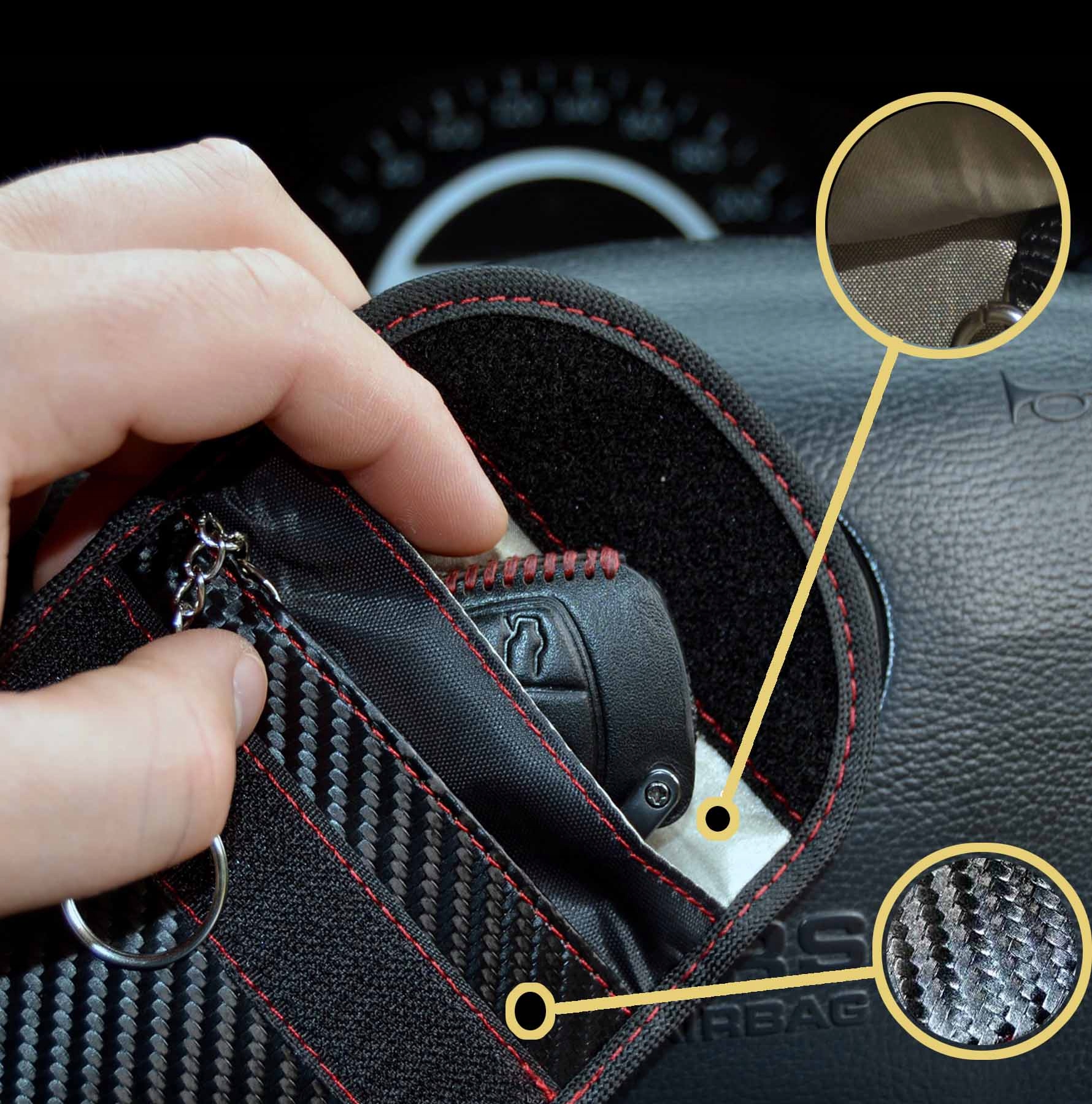 Każdy z pokrowców posiada dwie kieszonki. Aby zabezpieczyć samochód przed kradzieżą, należy włożyć klucz do kieszeni (tylnej) wyłożonej srebrno-złotym materiałem blokującym sygnał. Kieszonka czerwona (przednia) służy natomiast do przechowywania kluczyka podczas jazdy.
