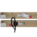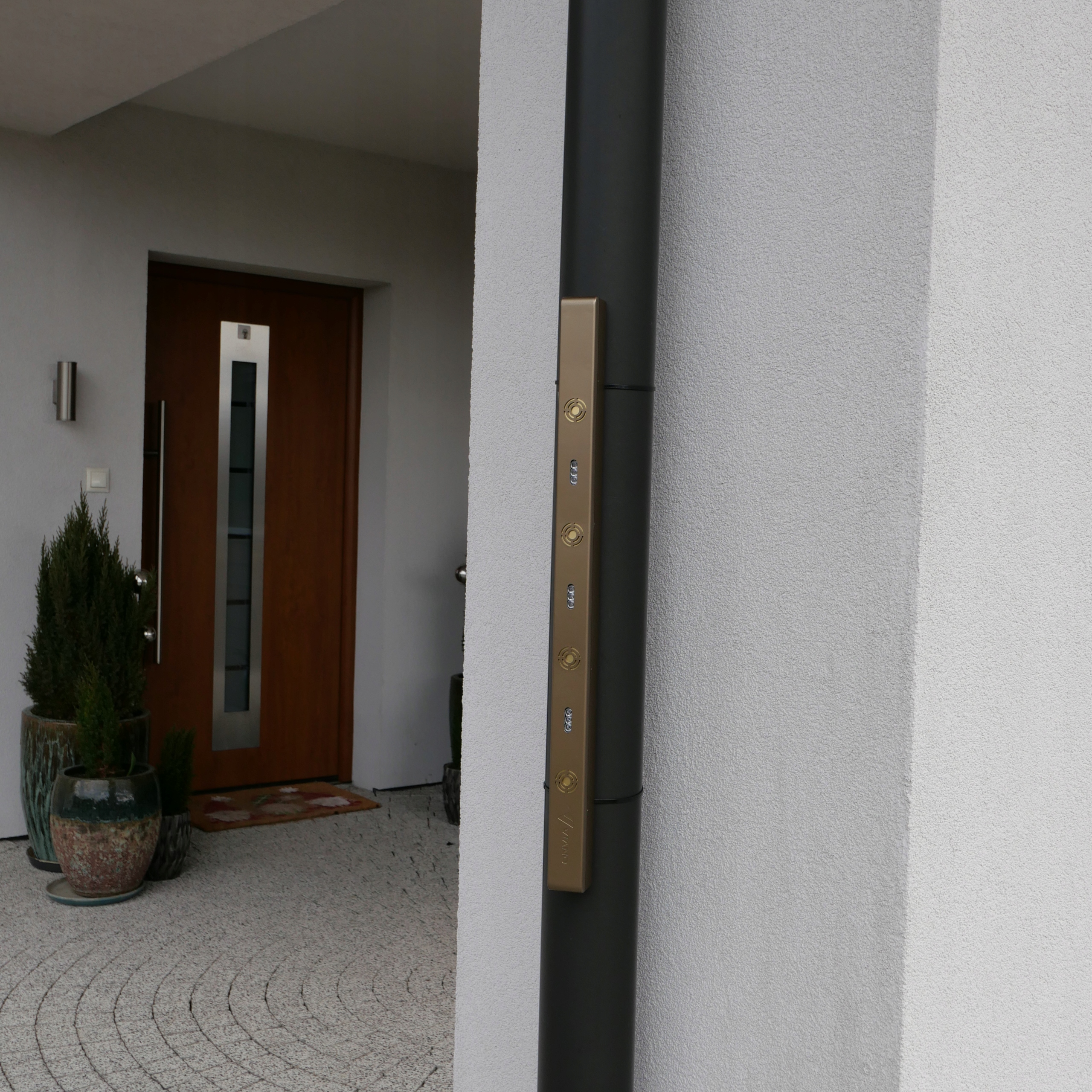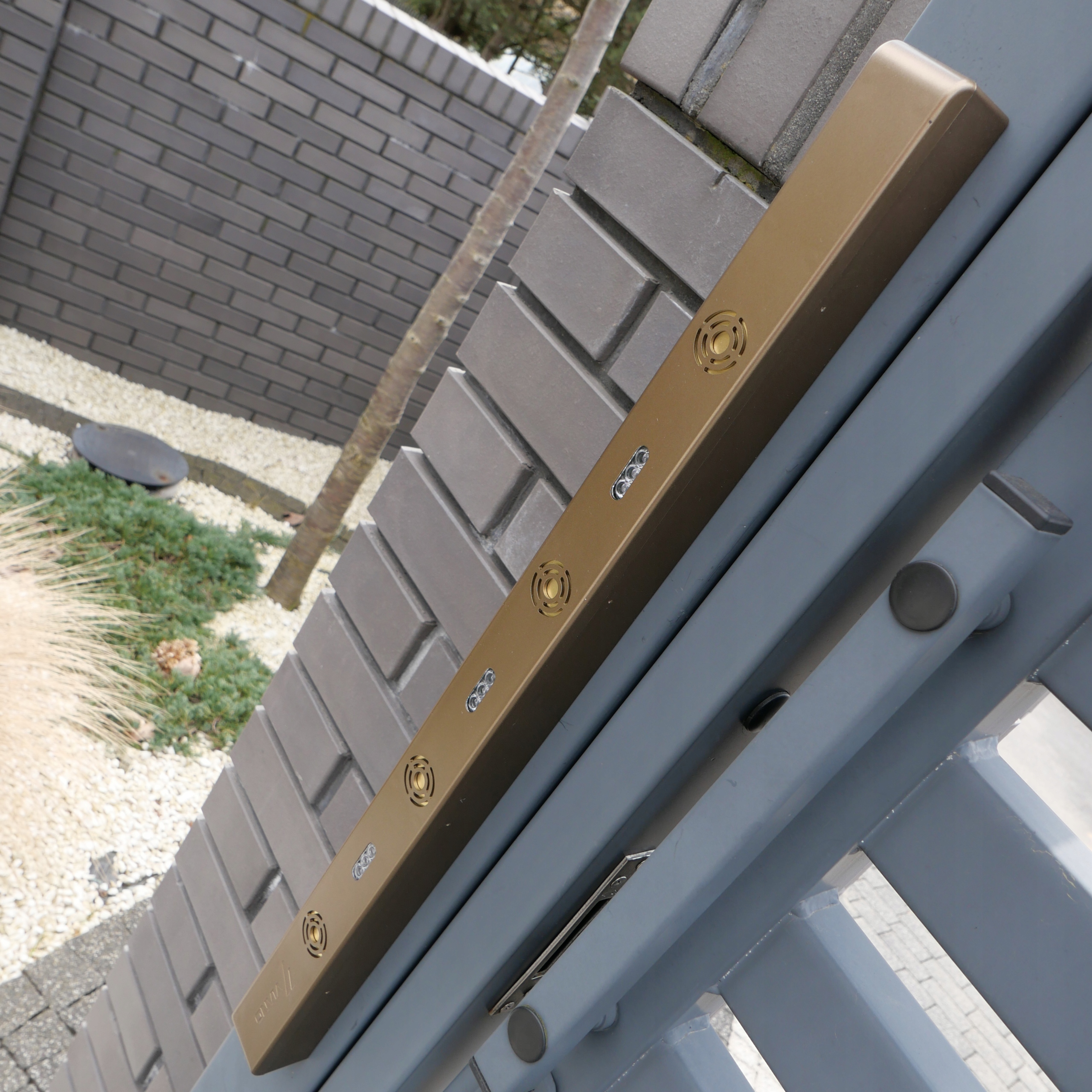 (1) Trzy magnesy neodymowe umieszczone w tylnej części obudowy służą do przytwierdzania odstraszacza do każdej metalowej powierzchni (rynna, odgrodzenie, okucie dachu, regał itp.) W zestawie z urządzeniem otrzymujemy metalowe blaszki z otworami, które za pomocą załączonych wkrętów można przykręcić do dowolnej powierzchni a następnie mocować do niej odstraszacz. Tym sposobem urządzenie możemy przymocować do desek czołowych, filarów drewnianych, drewnianych pergol itp.