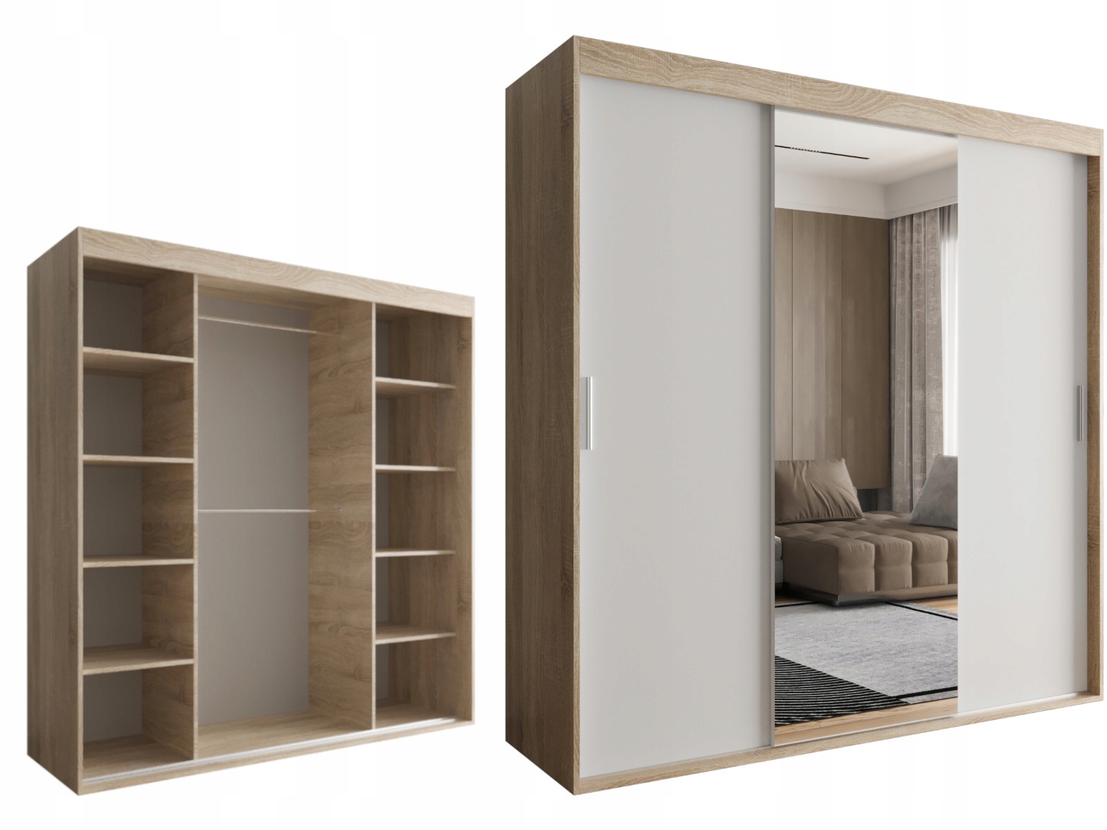 Nasza Szafa 3-Drzwiowa OLIMP w tej kwestii absolutnie dopasuje się do Twoich potrzeb. Przygotowaliśmy dla Ciebie dwa najbardziej Bestsellerowe wybarwienia: Dąb Sonoma oraz Biały Mat. Wnętrze szafy podzielone jest na 3 sekcje dzięki czemu z łatwością utrzymasz porządek i zorganizujesz przestrzeń.