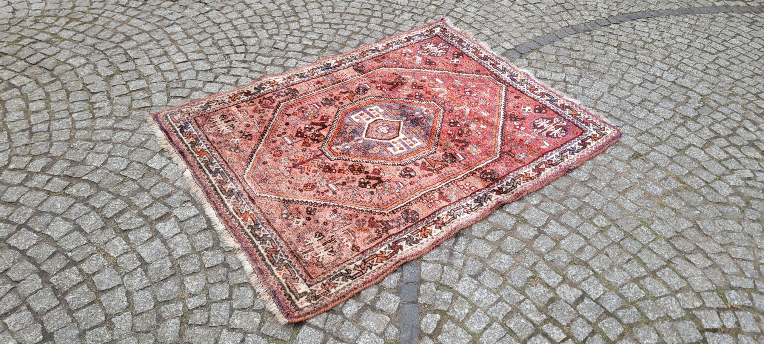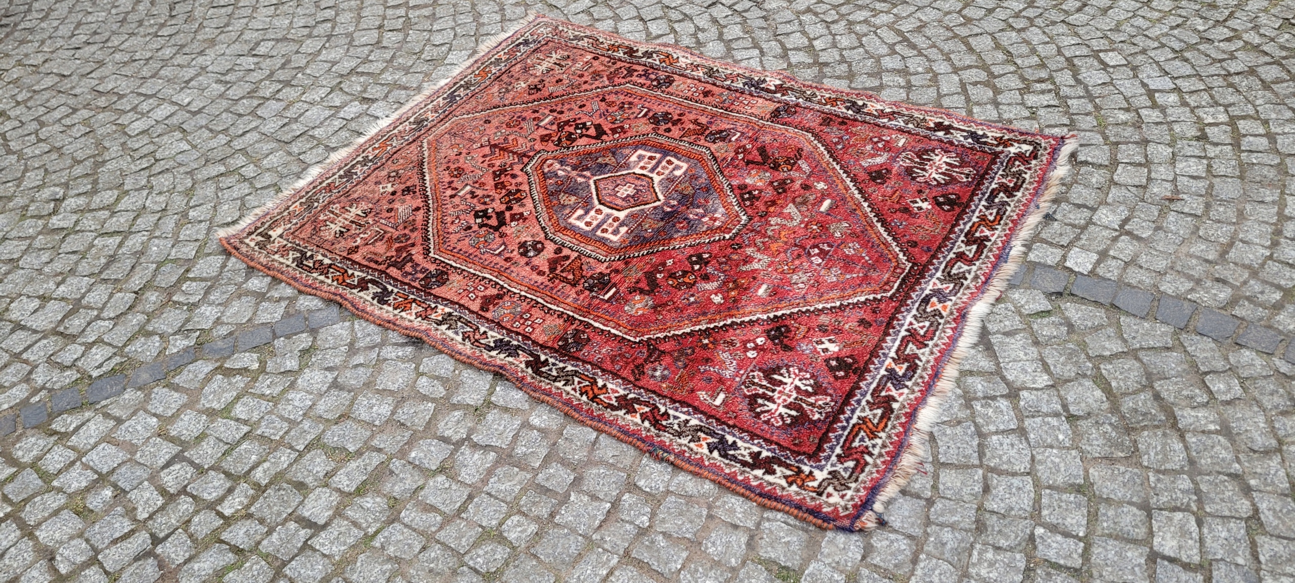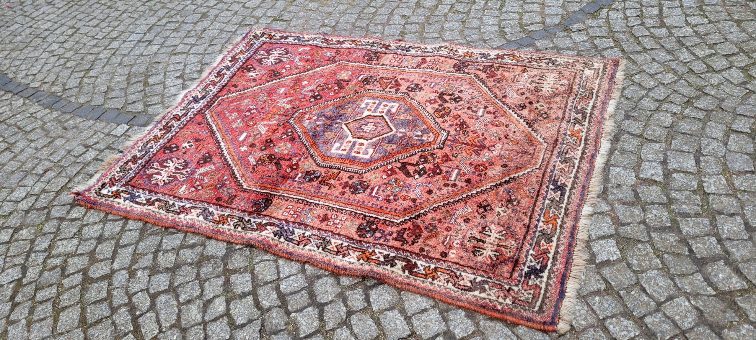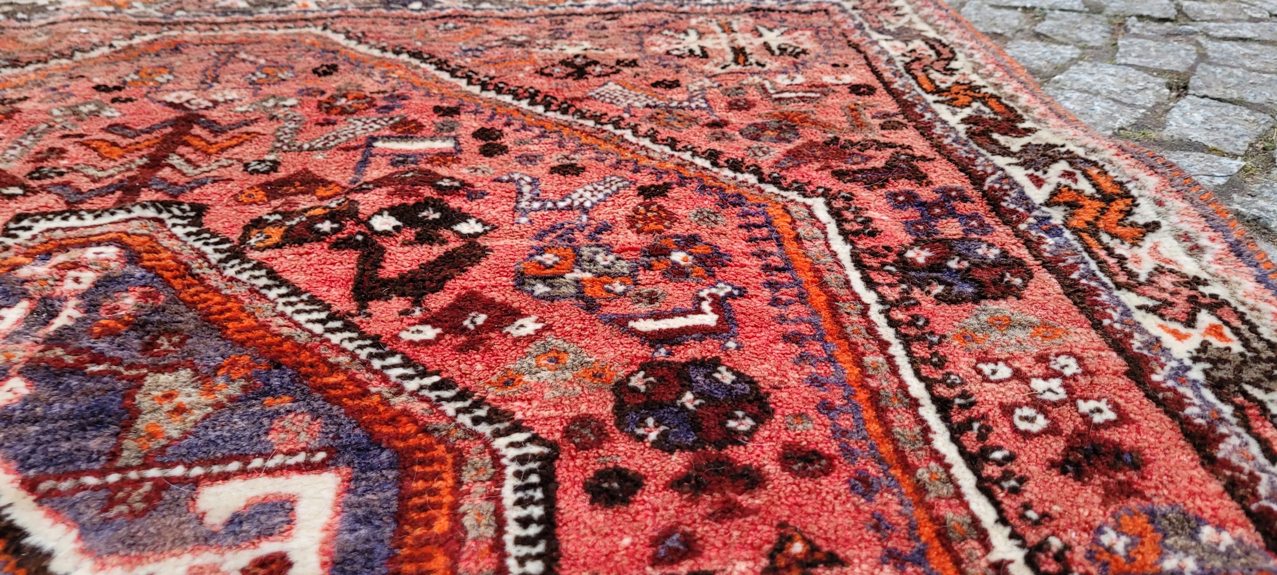 Nomadyczny, stary, perski dywan Kaszkaj. Tkany ręcznie z najwyższej jakości wełny. Charakteryzuje się piękną kolorystyką i wzornictwem. Jest zachowany w stanie, widocznym na zdjęciach. Posiada otarcia oraz wady krótkich brzegów.