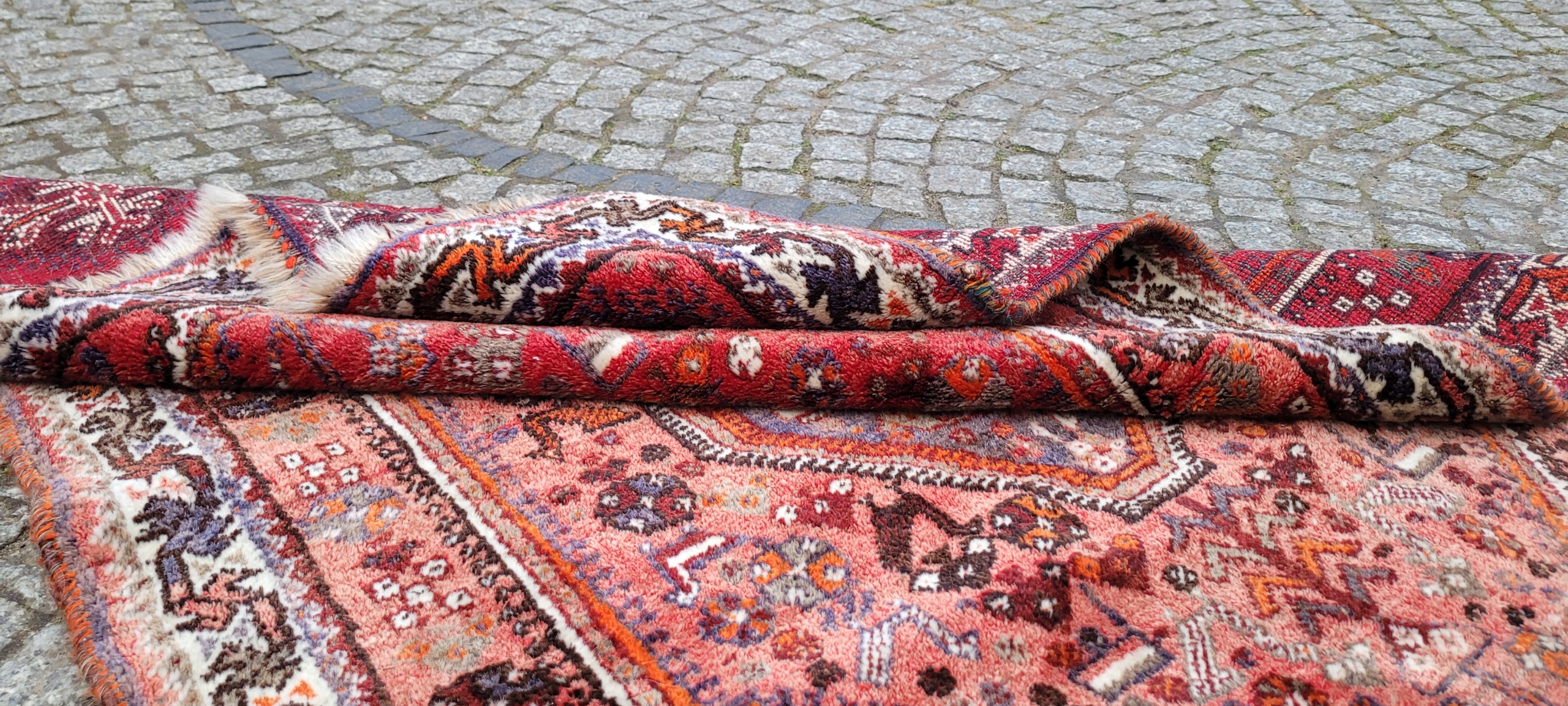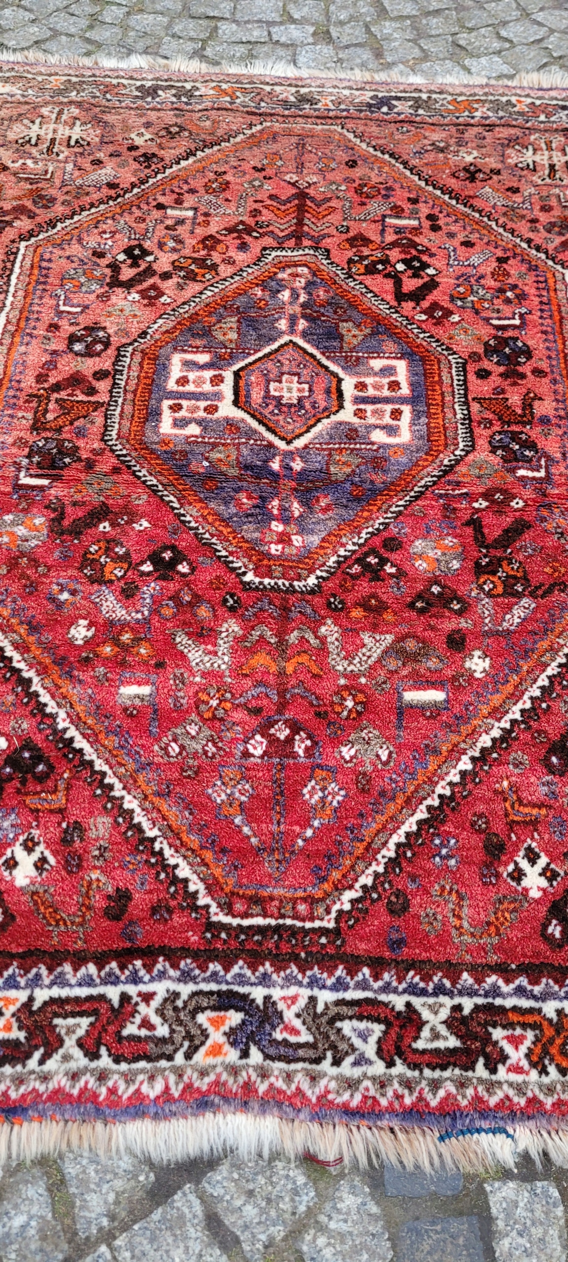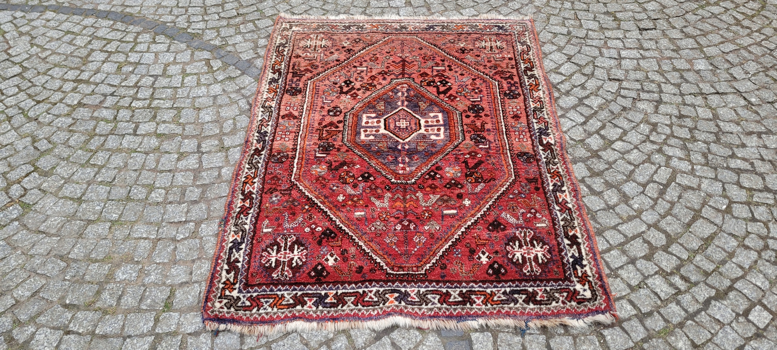 Nomadyczny, stary, perski dywan Kaszkaj. Tkany ręcznie z najwyższej jakości wełny. Charakteryzuje się piękną kolorystyką i wzornictwem. Jest zachowany w stanie, widocznym na zdjęciach. Posiada otarcia oraz wady krótkich brzegów.