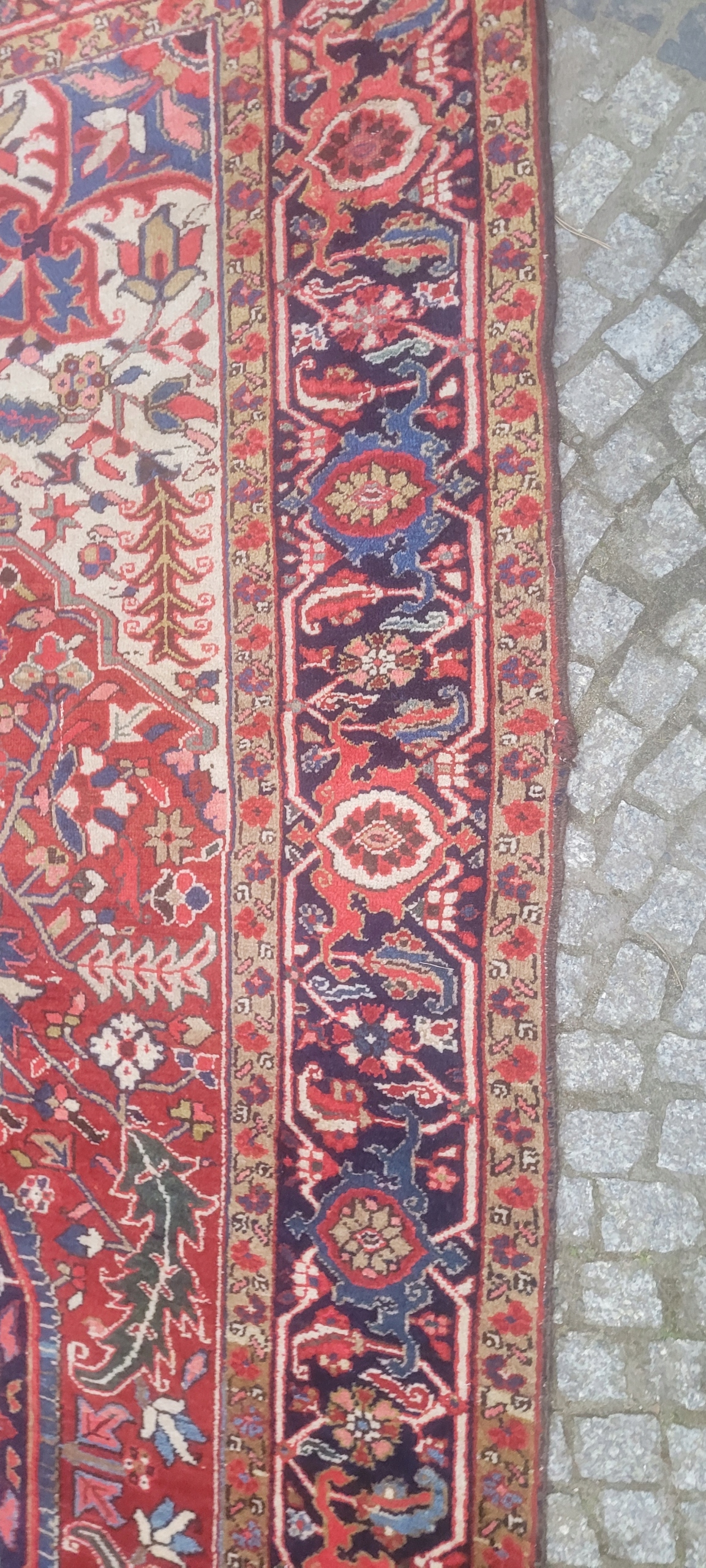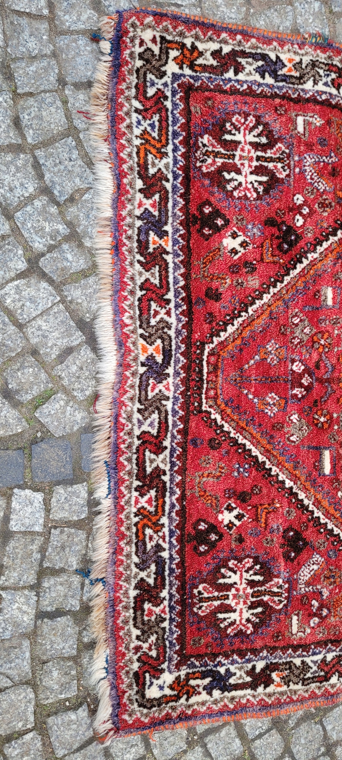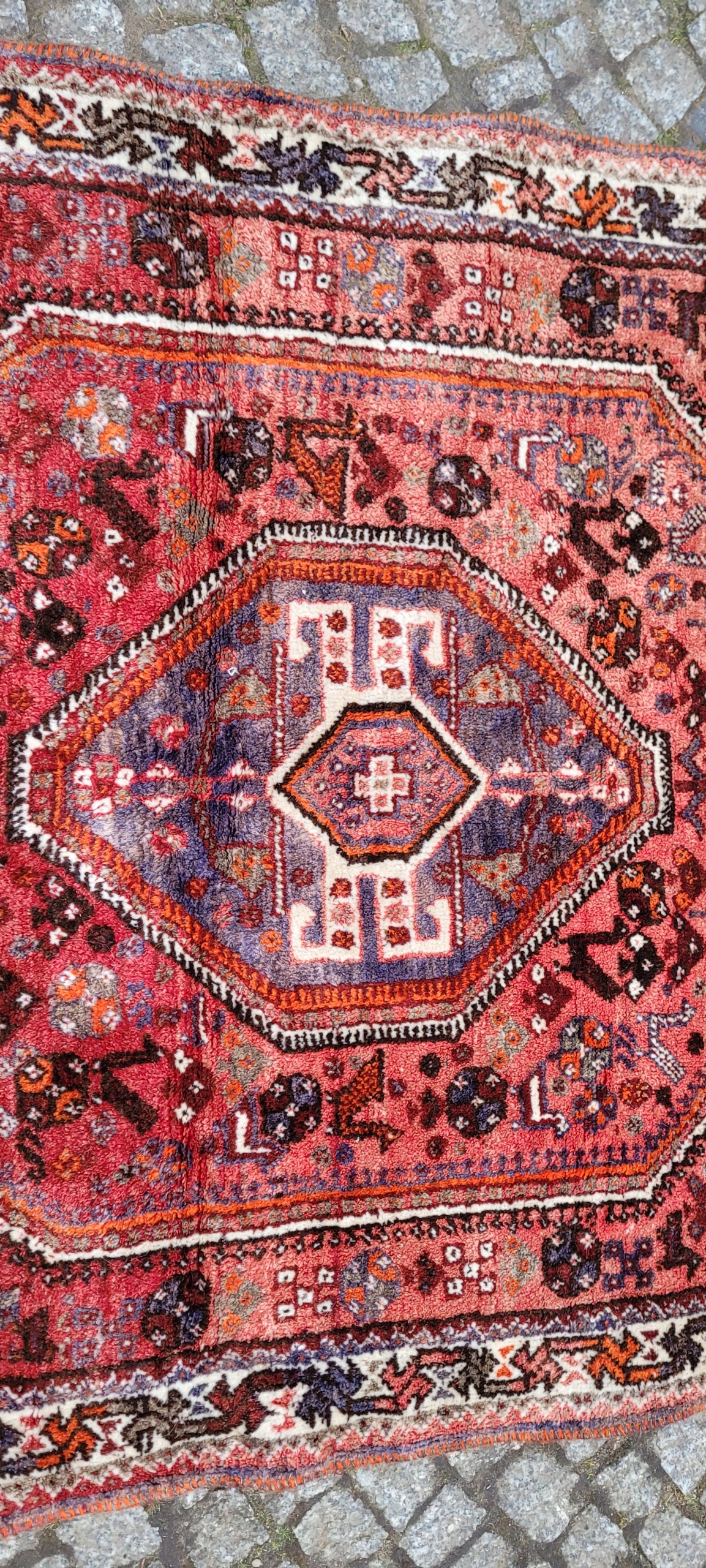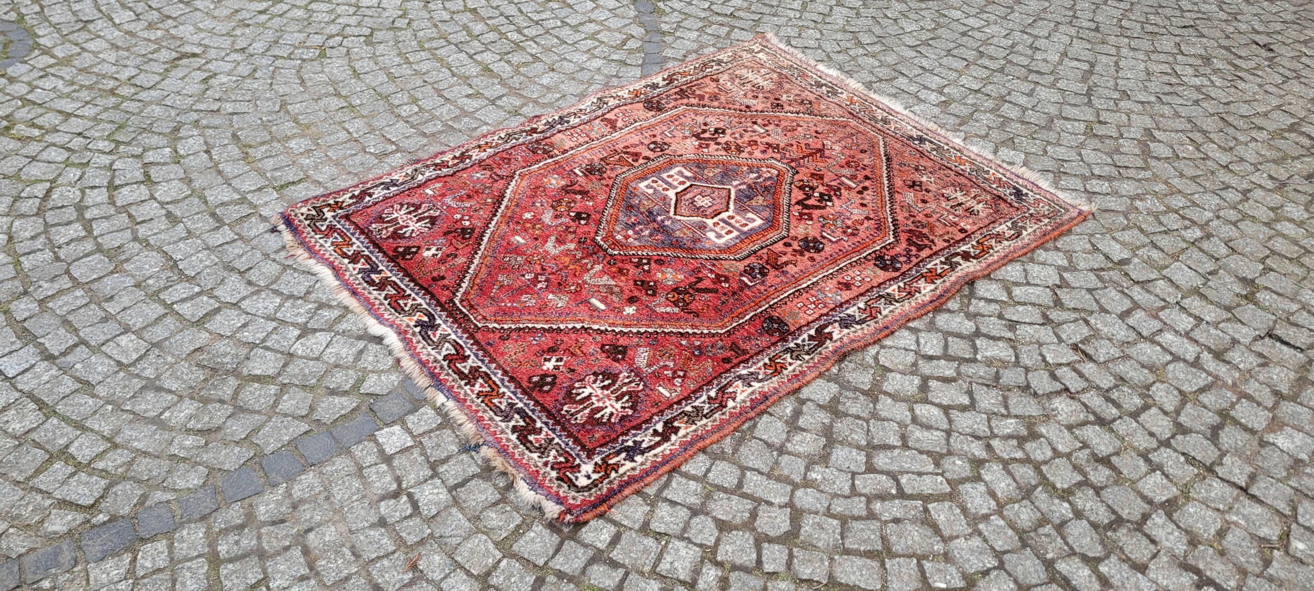 Nomadyczny, stary, perski dywan Kaszkaj. Tkany ręcznie z najwyższej jakości wełny. Charakteryzuje się piękną kolorystyką i wzornictwem. Jest zachowany w stanie, widocznym na zdjęciach. Posiada otarcia oraz wady krótkich brzegów.