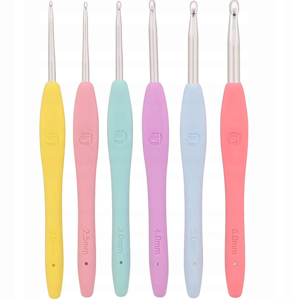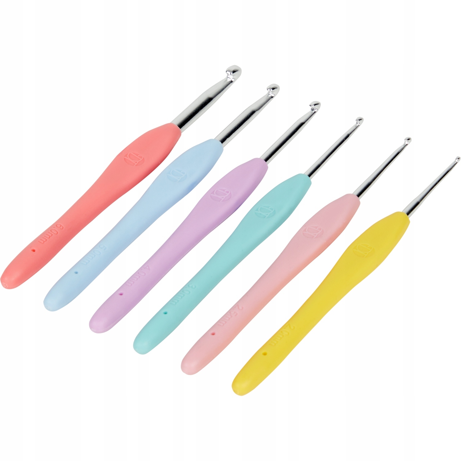 Zestaw zawiera 6 szydełek w różnych rozmiarach (2mm, 2.5mm, 3mm, 4mm, 5mm, 6mm), co pozwala na realizację różnorodnych projektów – od drobnych, precyzyjnych wzorów po większe i bardziej strukturalne prace.