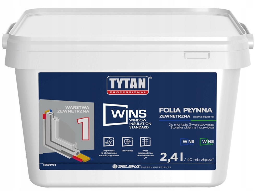 Folia płynna okienna WINS zewnętrzna jest jednoskładnikowym produktem, gotowym do użycia, tworzącym paroprzepuszczalną powłokę (strefa 1), która reguluje migrację wilgoci ze szczeliny okiennej do środowiska zewnętrznego budynku, co likwiduje degradację piany (strefa 2). Jest chemicznie neutralna i przylega do większości materiałów budowlanych. Tworzy elastyczną i paroprzepuszczalną powłokę. Dzięki jej elastyczności jest idealna do uszczelniania złączy ościeżnic z ościeżami w systemach WINS, w których zwykle występują niewielkie przemieszczenia. Powłoka w połączeniu z pianą izolującą WINS Flex lub WINS Fast i folią płynną WINS wewnętrzną tworzy odporne na wodę i wiatr połączenie ościeży z ościeżnicami zapobiegające stratom energii i możliwości zawilgocenia i zagrzybienia złącza. Złącze uszczelnione folią płynną WINS zewnętrzną jest odporne na niekorzystne warunki atmosferyczne w tym huragany do 160 km/h. Specjalistyczna folia płynna WINS zewnętrzna do uszczelniania okien jest wzmocniona włóknami polimerowymi i ma bardzo wysoką - 10 lat - odporność na promieniowanie UV.