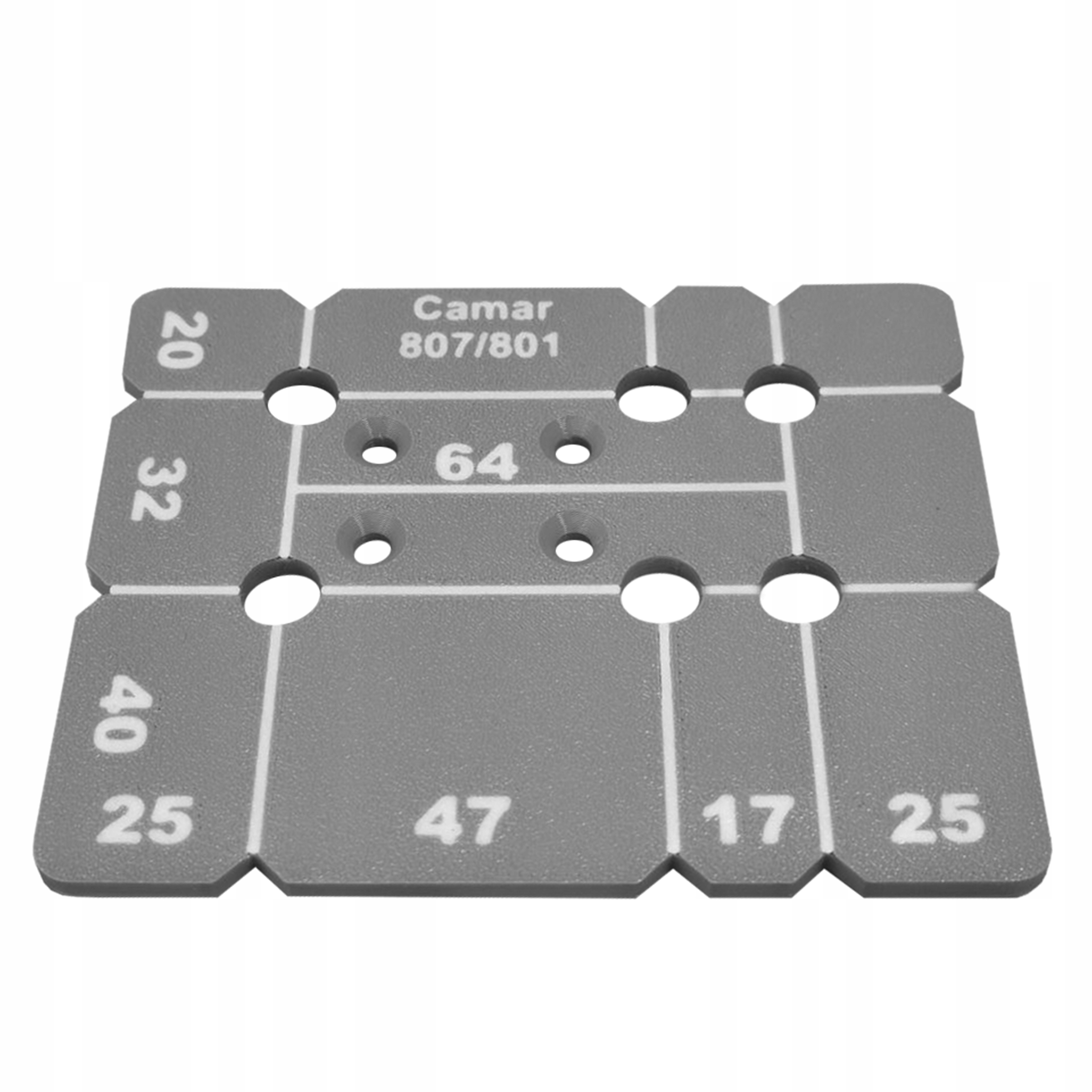W ofercie znajdziesz 1 sztukę szablonu do zawieszek CAMAR 807/801 w kolorze szarym z białymi oznaczeniami.