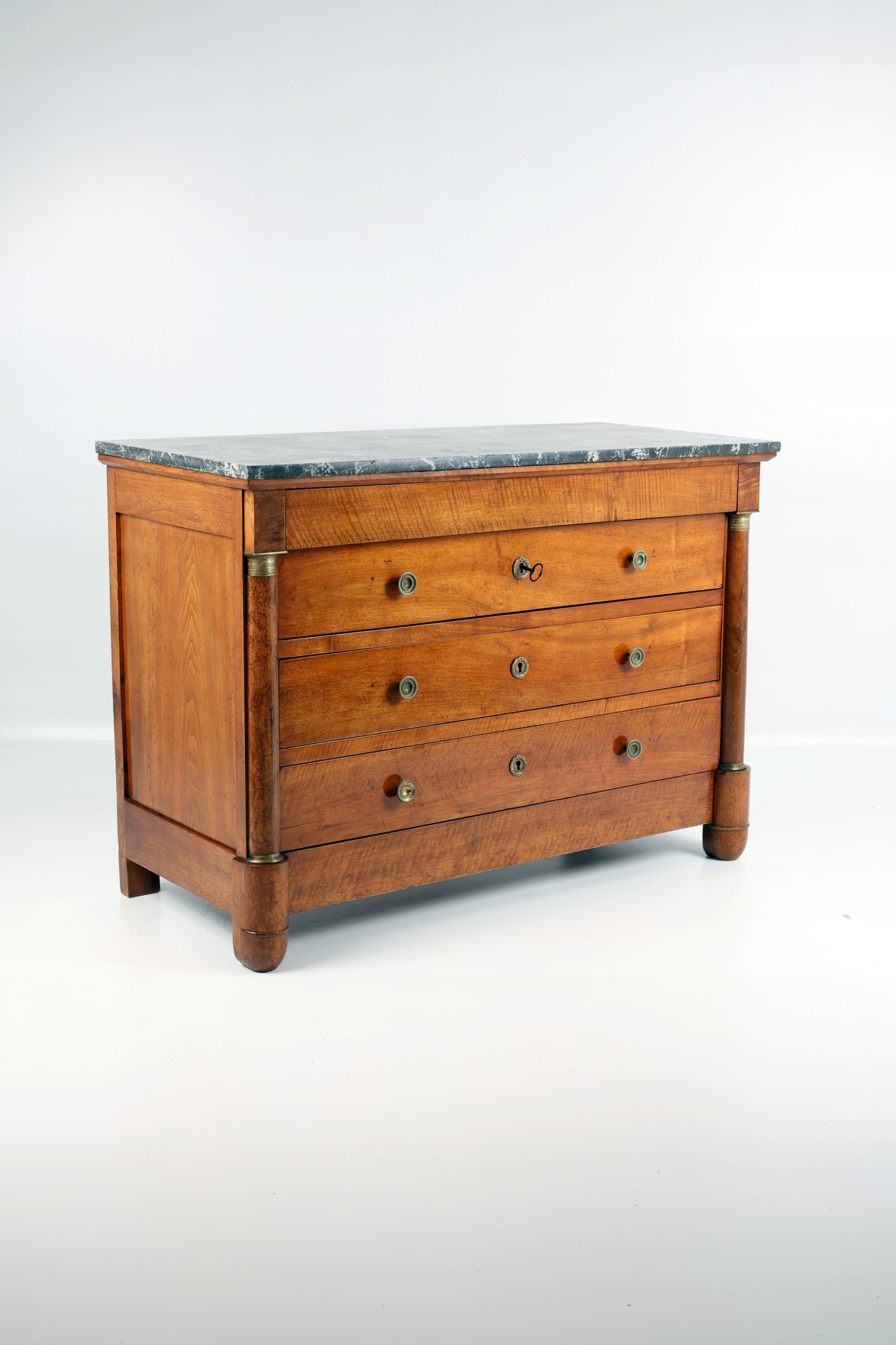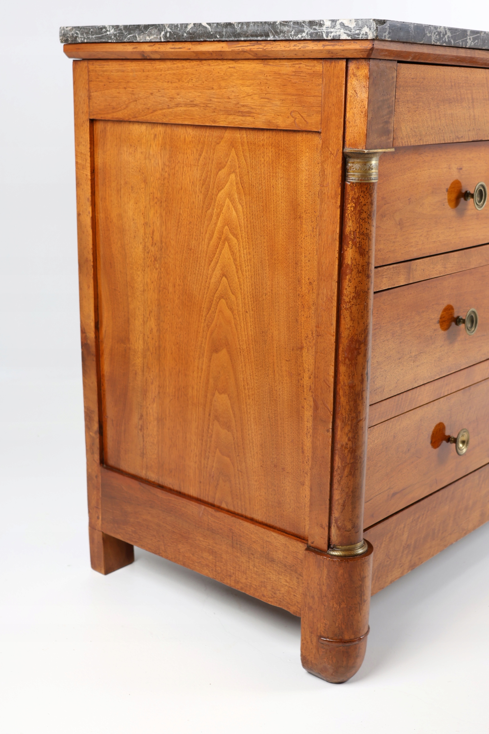 Elegancka, zabytkowa komoda wykonana z orzecha włoskiego, zwieńczona efektownym czarnym marmurowym blatem. Piękne usłojenie drewna zdobi zarówno front, jak i boki mebla, podkreślając jego ponadczasowy charakter. Dwie klasyczne półkolumny flankują front komody, ozdobione misternie wykonanymi brązowymi kapitelami i bazami z motywami liści akantu oraz spiralnym perełkowaniem.