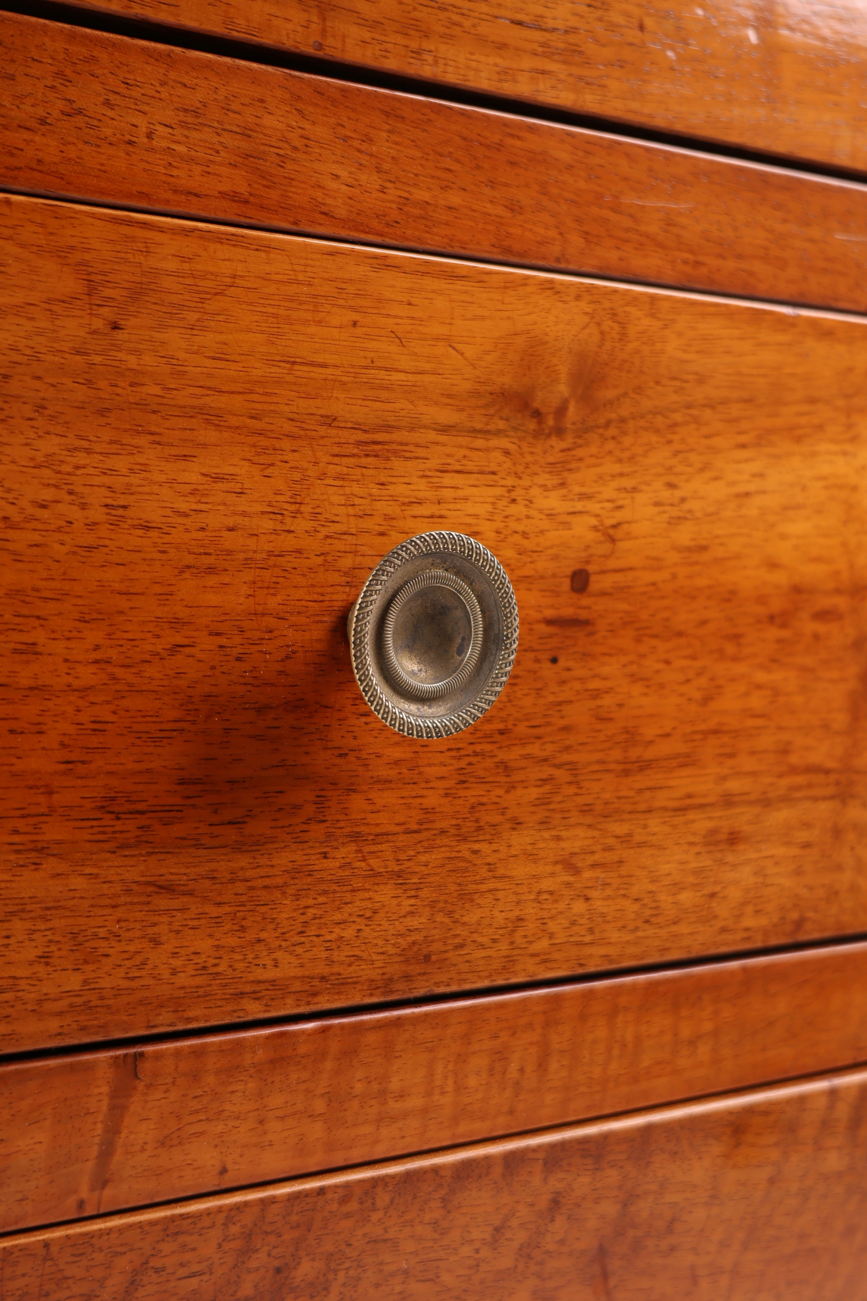 Komoda oferuje dużą przestrzeń do przechowywania dzięki trzem pojemnym dolnym szufladom o solidnej konstrukcji na jaskółczy ogon, wyposażonym w eleganckie brązowe uchwyty i tarcze zamków. Czwarta, dyskretnie wbudowana szuflada znajduje się tuż pod marmurowym blatem.
