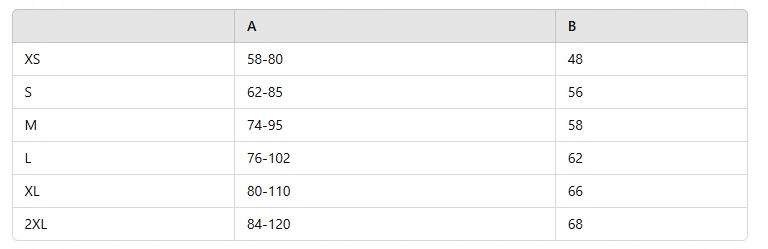 A - obwód pod pachami bez rozciągania - do maksymalnego rozciągnięcia (cm)