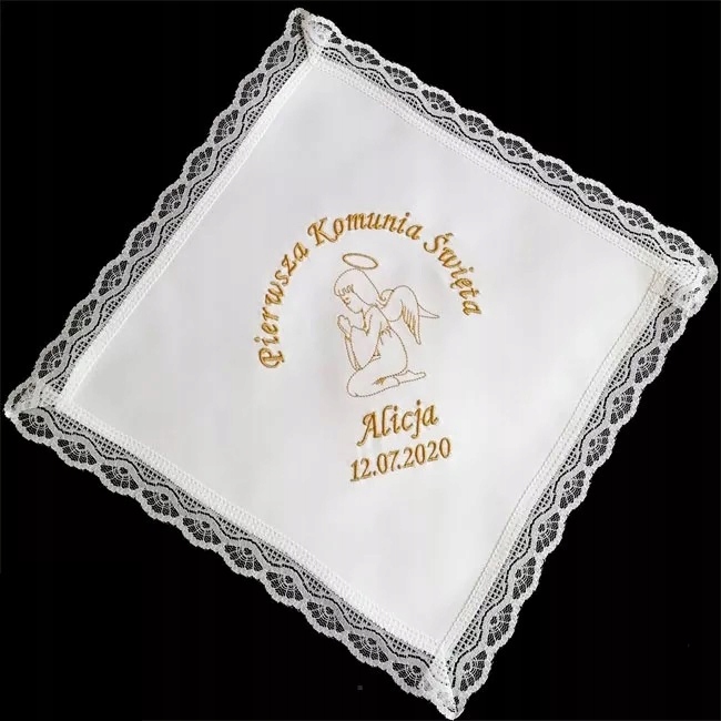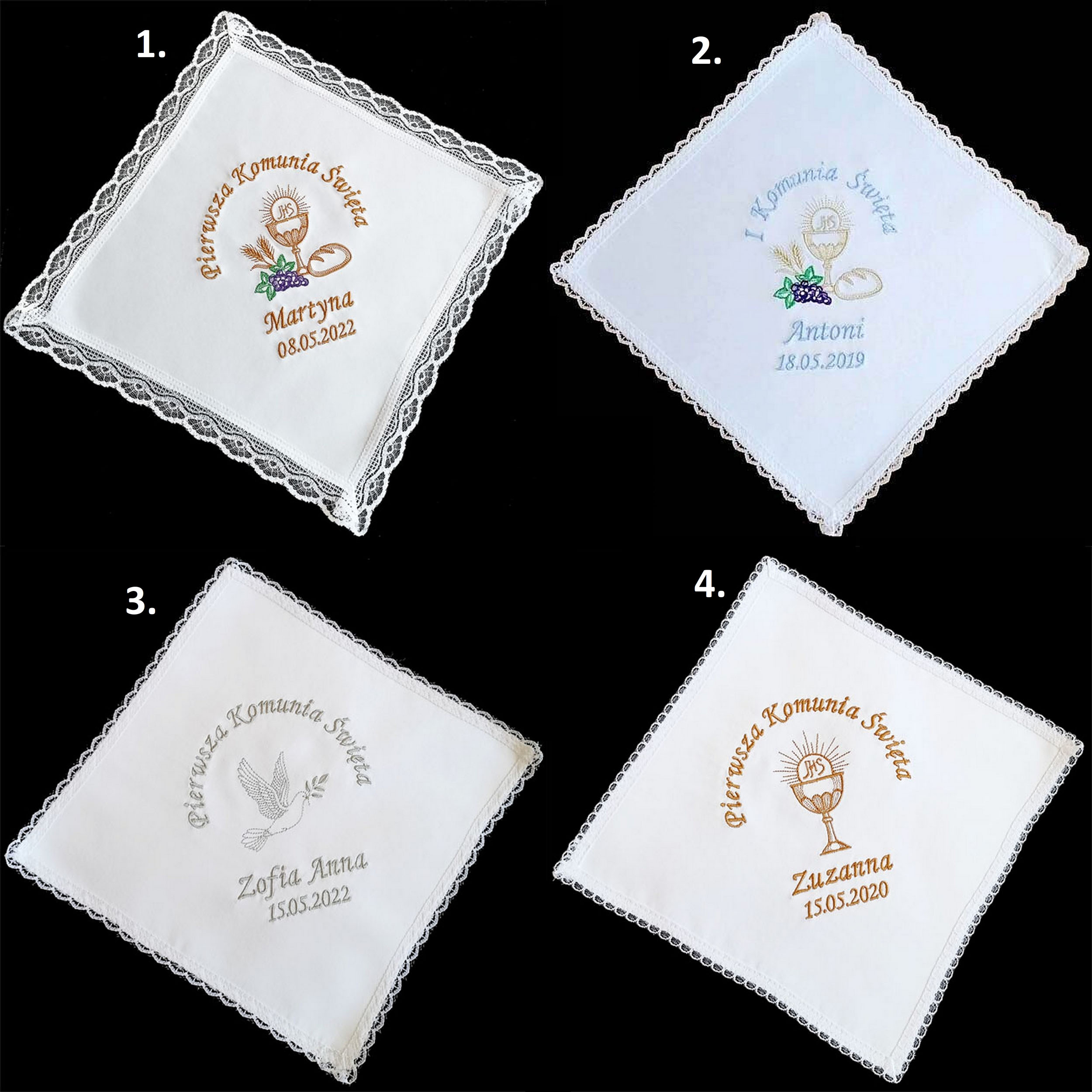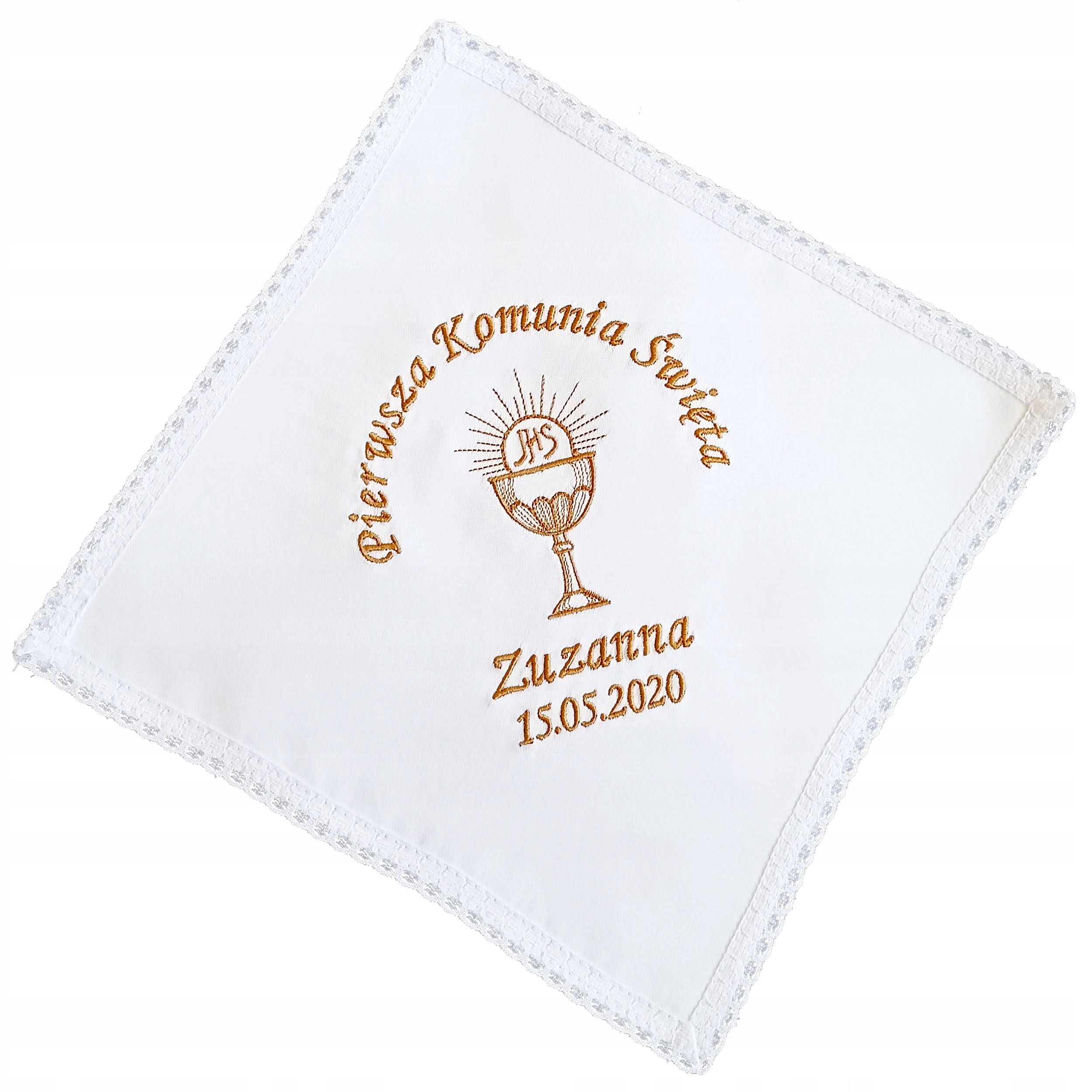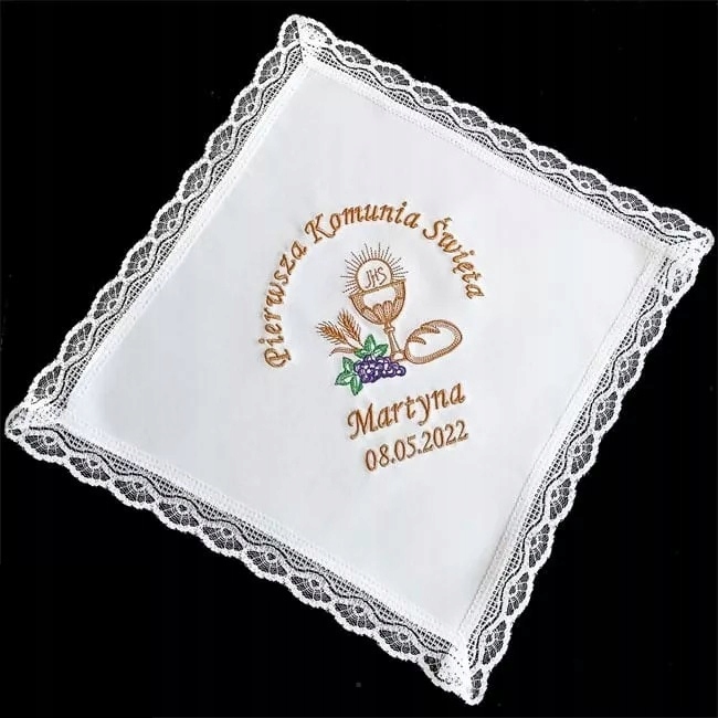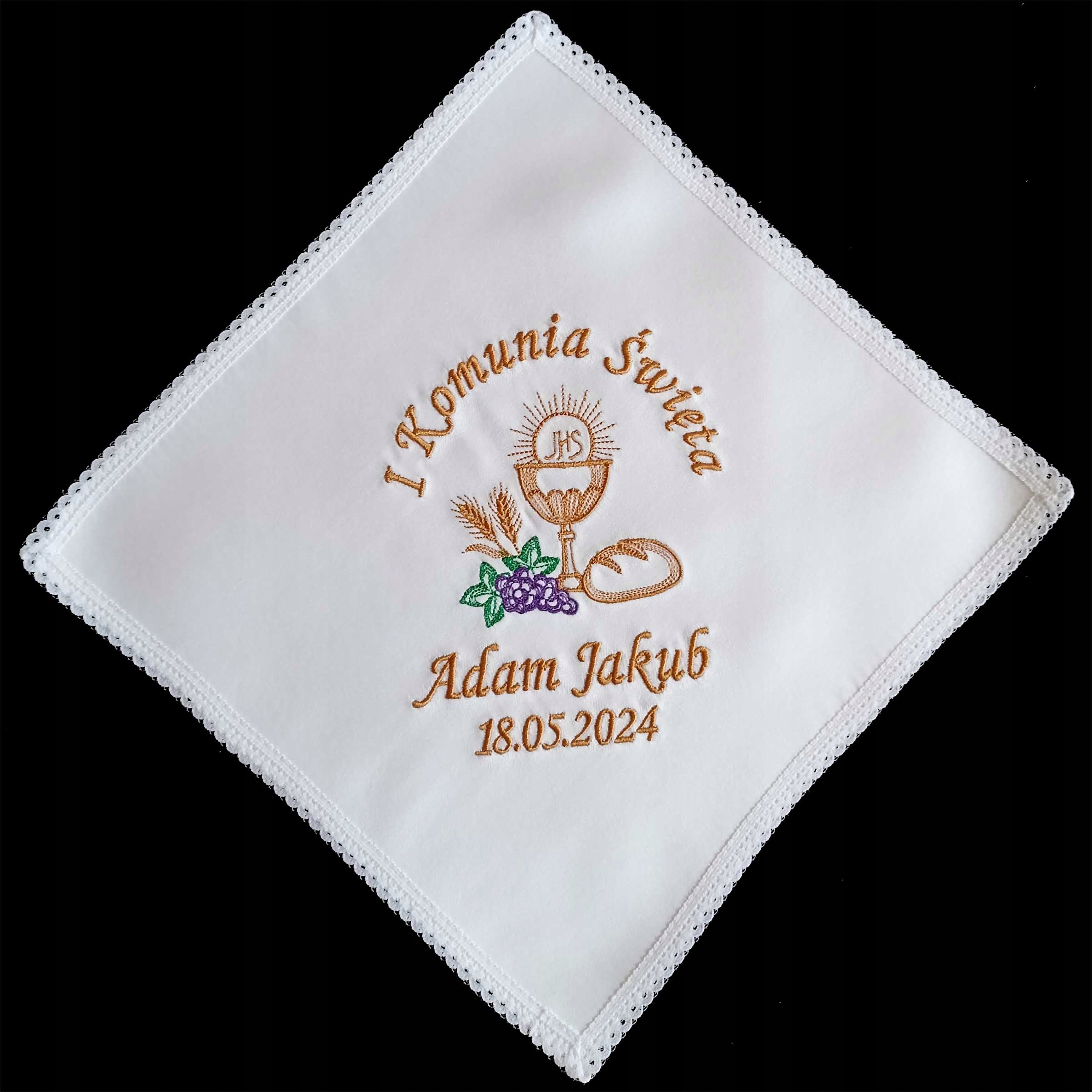 Oferujemy niepowtarzalną chusteczkę z Twoim z indywidualnym haftem, która będzie cudowną Pamiątką I Komunii Świętej i sprawi,