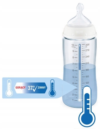 Aby mieć pewność, że pokarm podawany nie będzie zbyt gorący, butelka NUK First Choice+ posiada wskaźnik temperatury Nuk. Wskaźnik wygląda jak termometr i jest umieszczony pomiędzy kreskami podziałki. Wskaźnik zmienia kolor pod wpływem zmiany temperatury zawartości butelki.