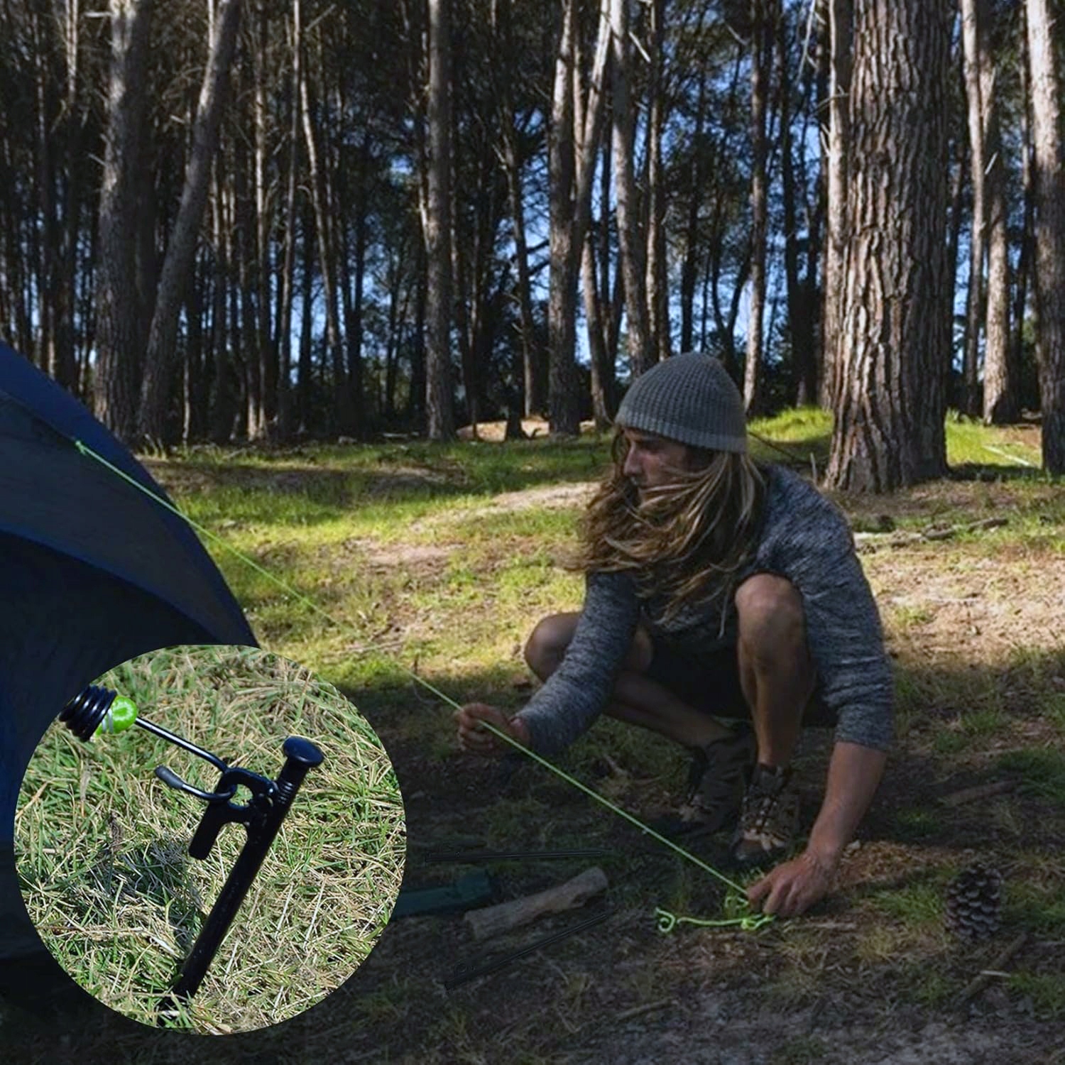 2️⃣ Doskonała przyczepność – Ostra końcówka ułatwia wbijanie w twarde, kamieniste i gliniaste podłoże, zapewniając stabilność namiotu.