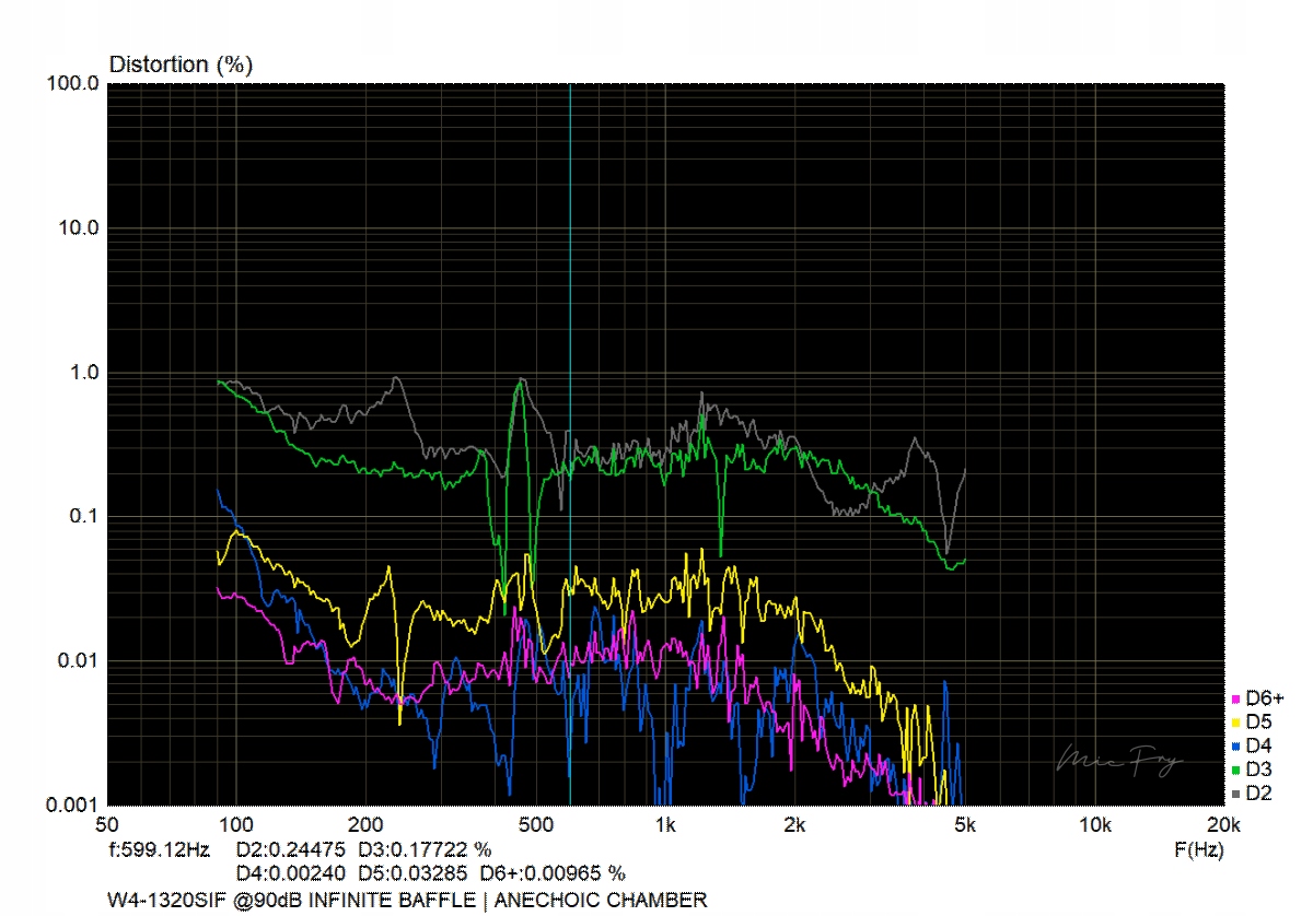 Skuteczność tej technologii można zaobserwować na wykresie zniekształceń harmonicznych (przy poziomie 90dB - na zdjęciu). Całkowite zniekształcenia utrzymują się na poziomie 0,2 - 0,5% i mają wyrównane przebiegi, przy czym najbardziej szkodliwe, wyższe harmoniczne sprowadzone zostały do regionu 0,01 - 0,04%. Co istotne, zniekształcenia nie rosną ani przy najniższych częstotliwościach pasma użytkowego, ani w zakresie kilku kilohertzów, co jest typową bolączką "zwykłych" konstrukcji.