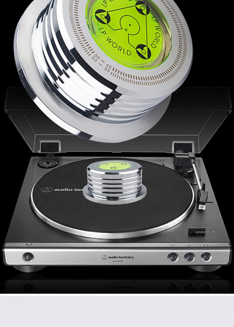 Funkcja: wyeliminuj wibracje, stała prędkość, utrzymuj poziom gramofonu LP.