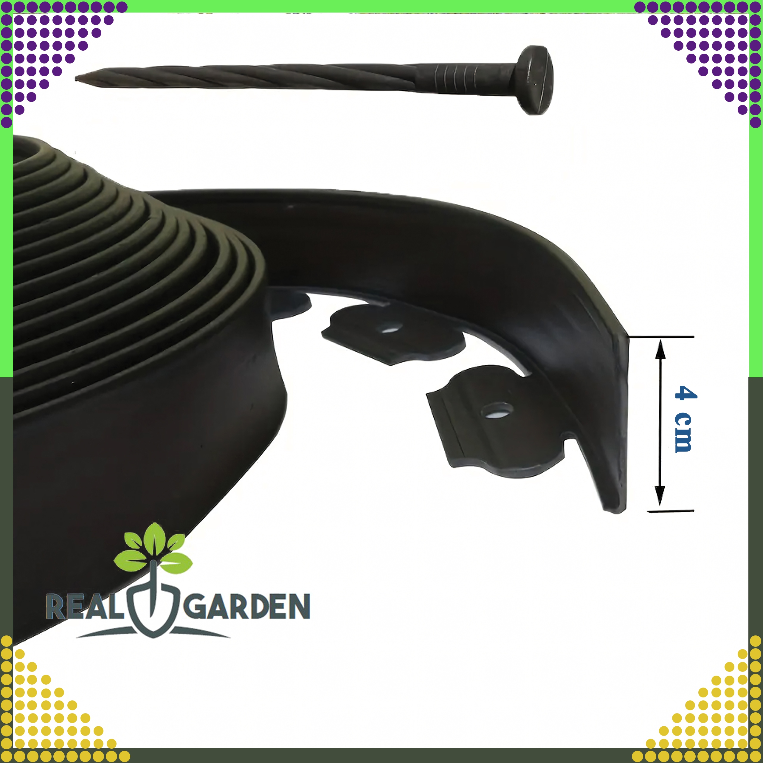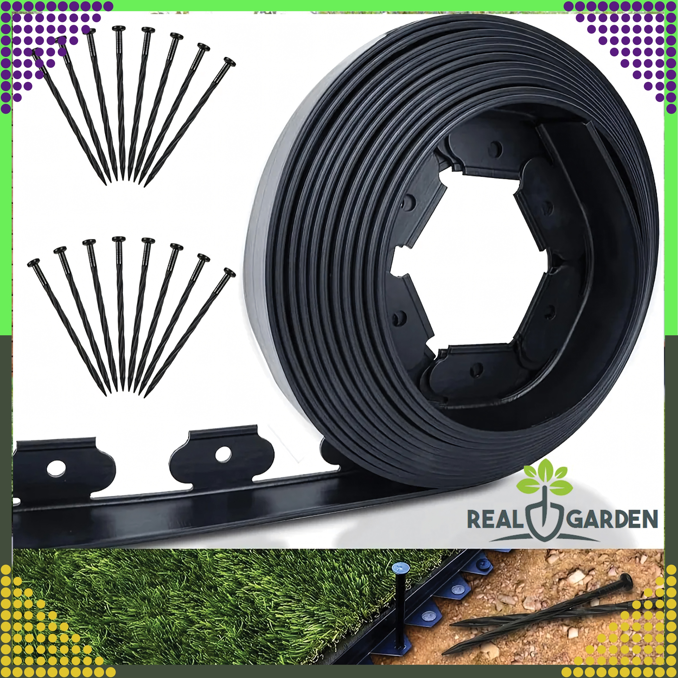 Elastyczne obrzeża można dopasować do dowolnego kształtu, a zestaw zawiera 30 kotew zapewniających stabilne mocowanie.