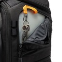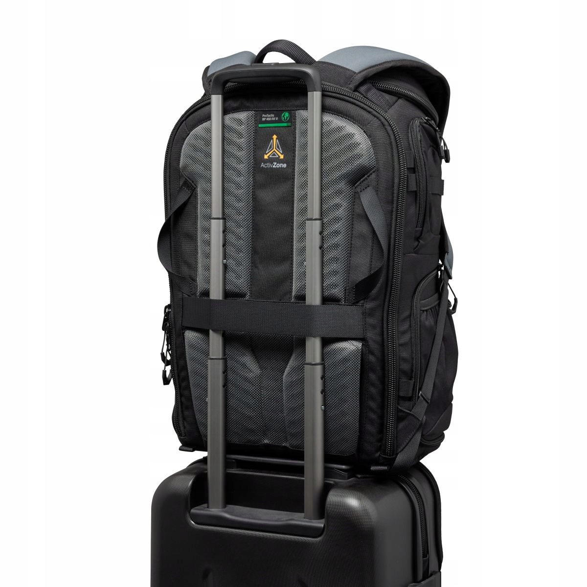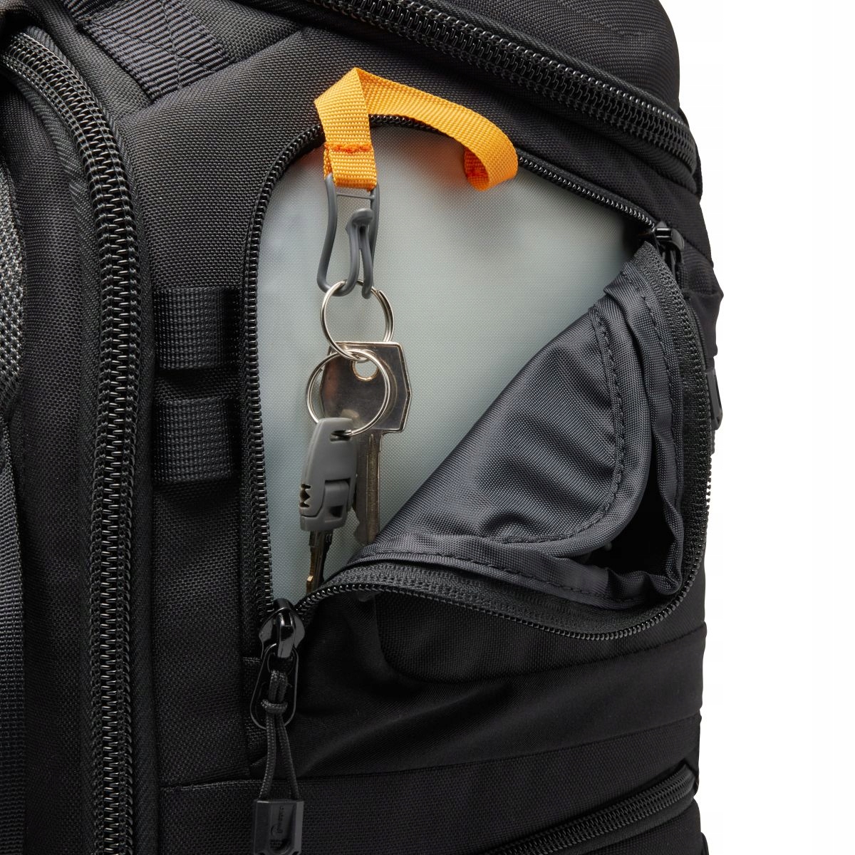 Boki plecaka wyposażone są w duże, elastyczne kieszenie (na bidon czy dodatkowy statyw) oraz dwie mniejsze kieszonki zapinane na zamek, w tym jedna z karabińczykiem, np. na klucze. Odpinany, tylny panel również skrywa kilka kieszeni – m.in. wyściełane, zapinane na zamek miejsce na 16-calowego laptopa. Mniejsze akcesoria można umieścić w przezroczystych kieszonkach, dzięki czemu będzie łatwo je zlokalizować w razie potrzeby. Miejsce na inne przedmioty osobiste znajduje się też pod górną pokrywą plecaka. Na podręczne drobiazgi, takie jak okulary przeciwsłoneczne, przewidziano elastyczną kieszonkę na szelce.