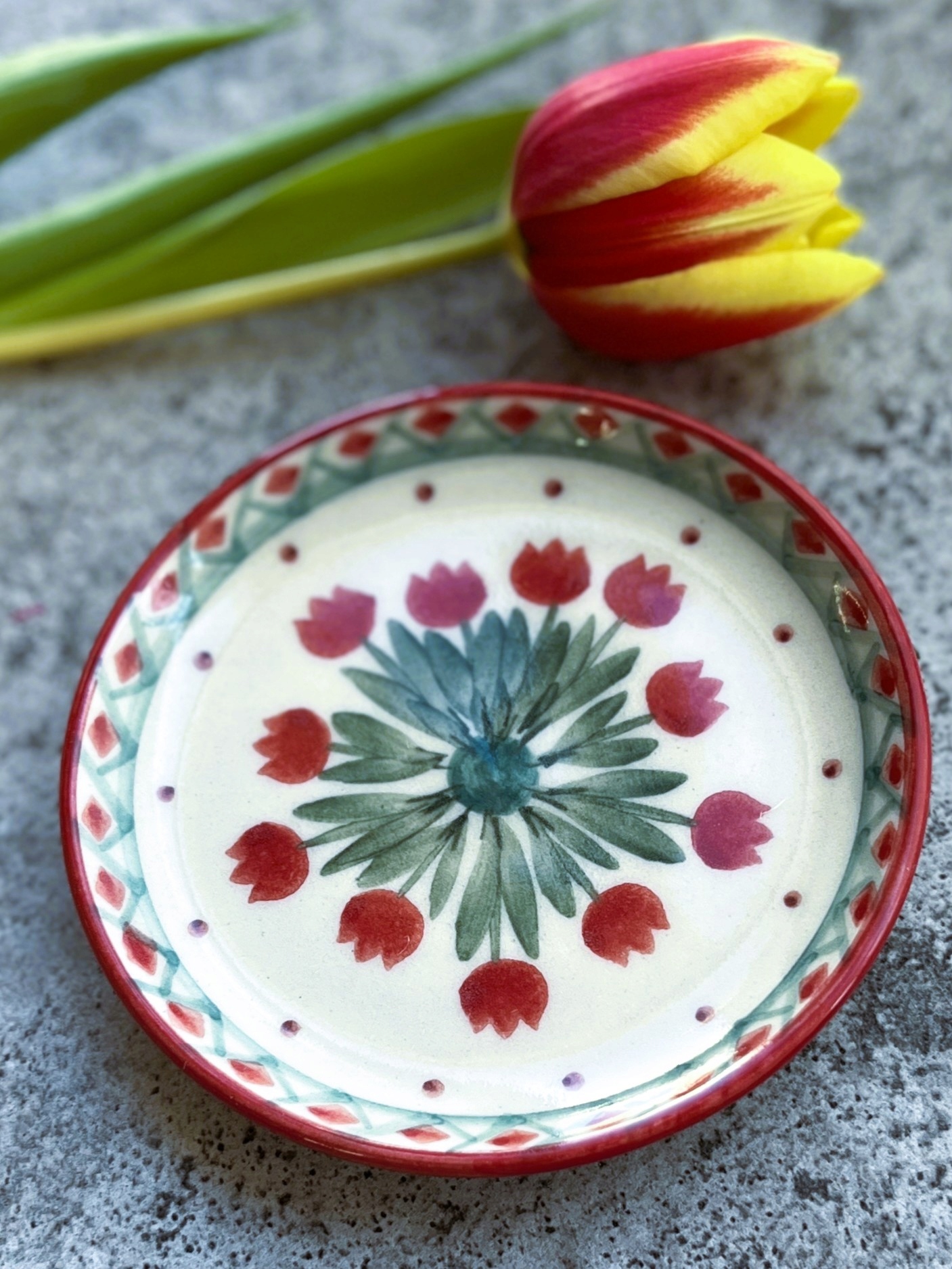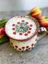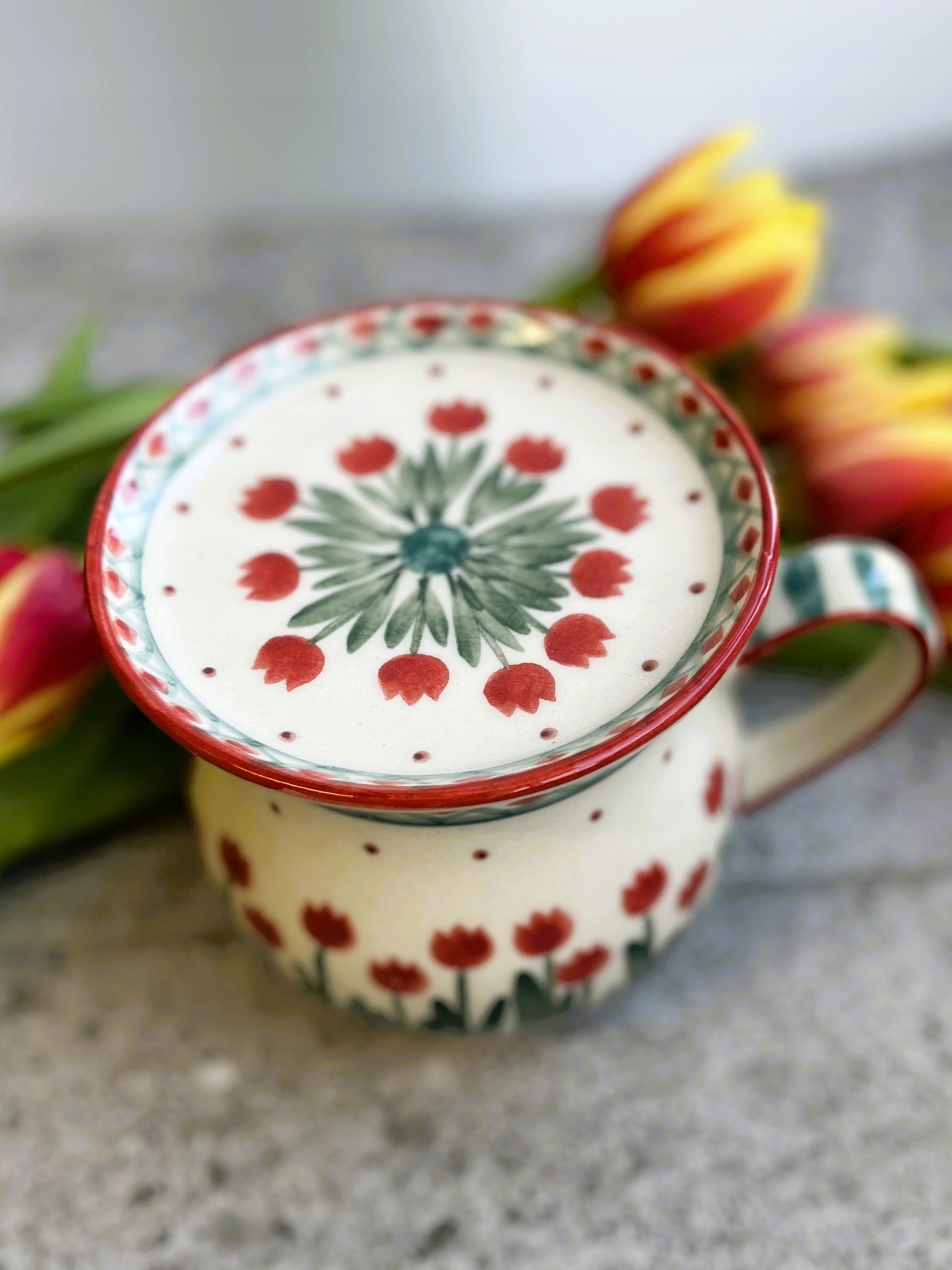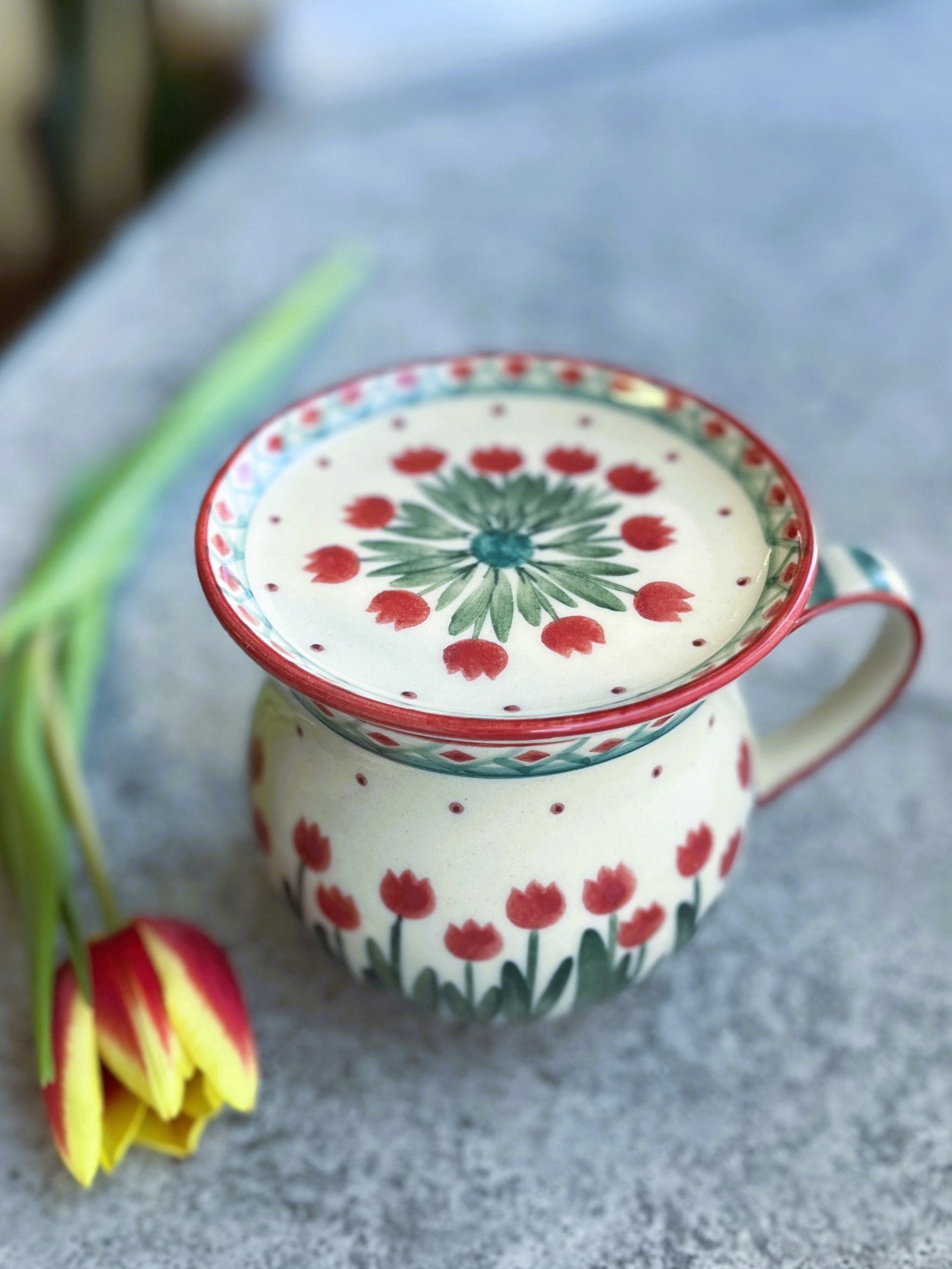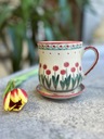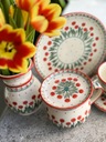 Każdy egzemplarz pomalowałam ręcznie, co czyni go niepowtarzalnym. Forma wykonana jest z wysokiej jakości glinki ceramicznej, która zapewnia trwałość i odporność na stosowanie w zmywarce.