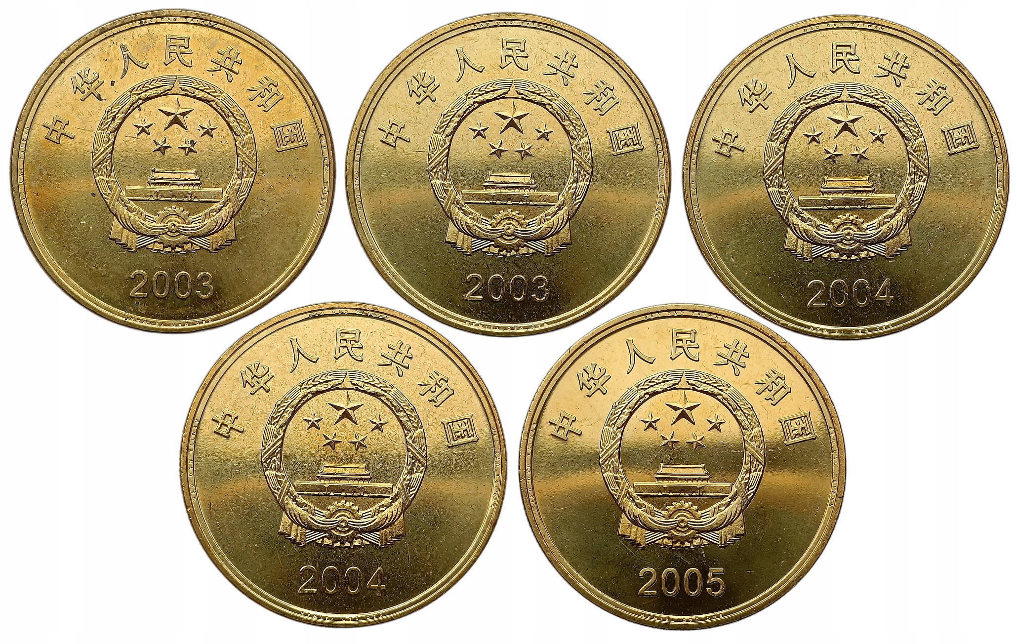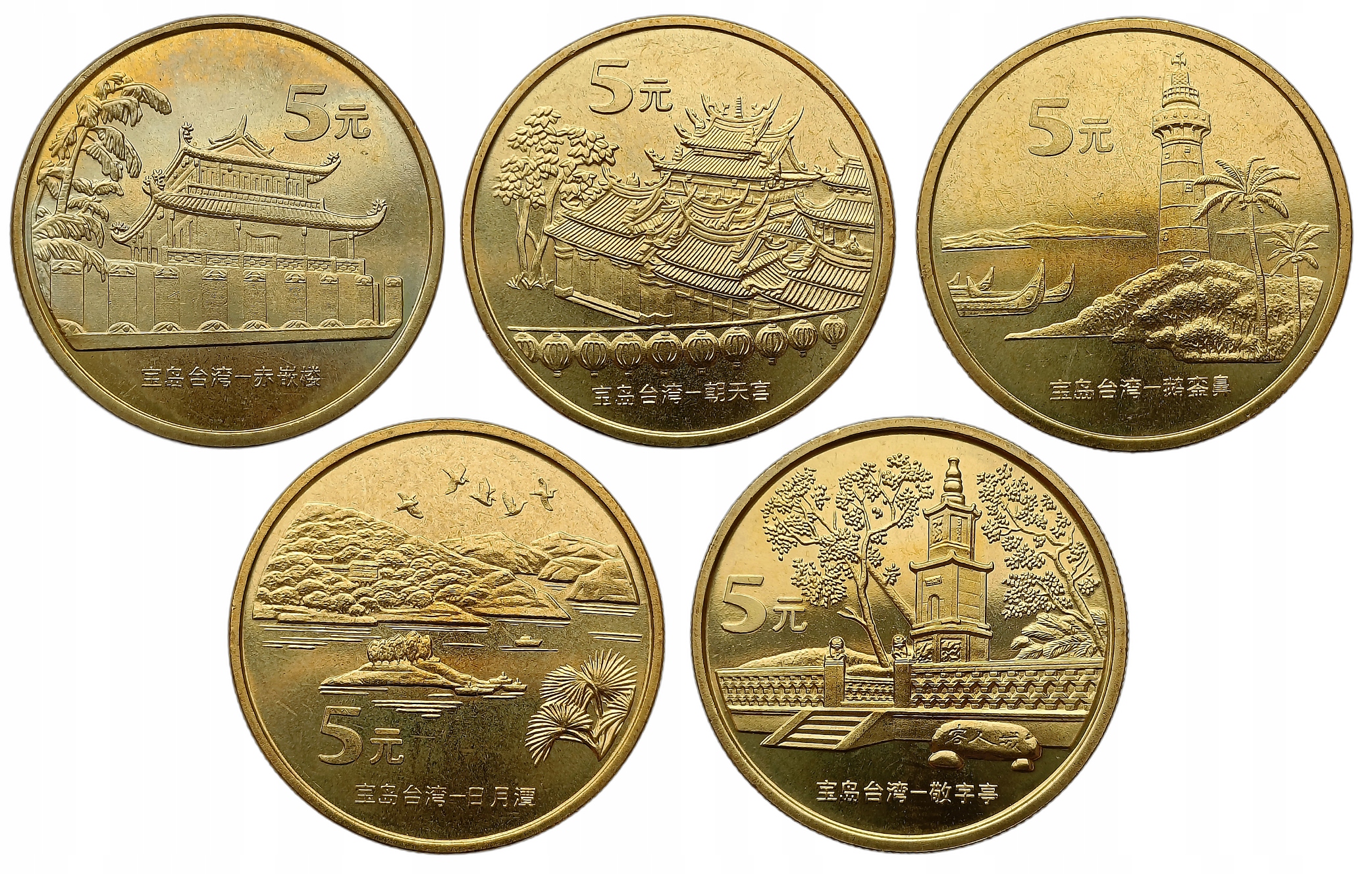 Zestaw pięciu monet z Chin wybitych w latach 2003 - 2005 o nominale 5 juan każda. Monety wydane z okazji różnych wydarzeń i miejsc związanych z chińską kulturą i architekturą, w tym świątynie i latarnie. Stan menniczy (UNC) sprawia, że zestaw jest atrakcyjny dla kolekcjonerów monet okolicznościowych.