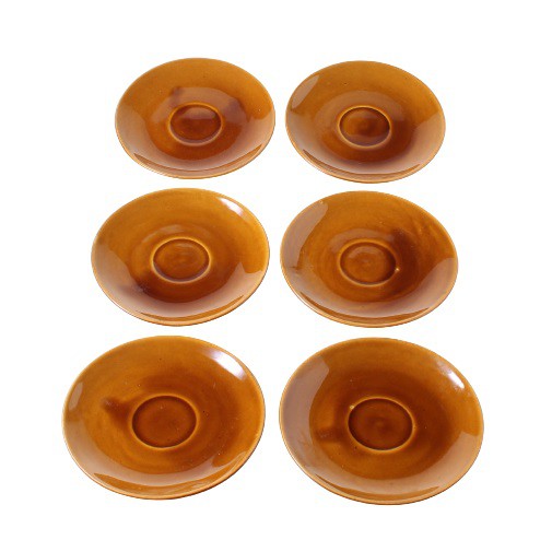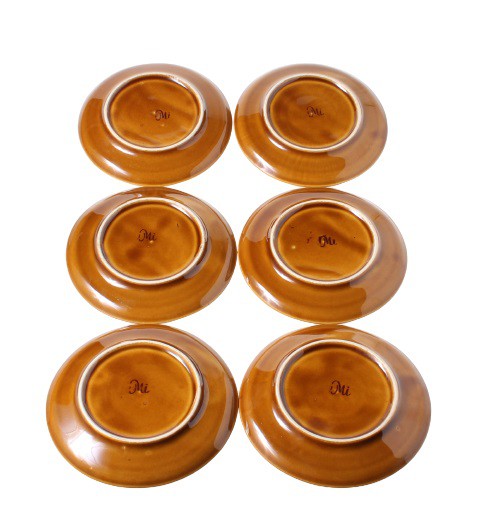Brak pęknięć i odprysków. Niedoszkliwienie na czubku pokrywki dzbanka ok. 1mm. Na taflach talerzyków kilka niewielkich przetarć szkliwa i punktowych niedoszkliwień.