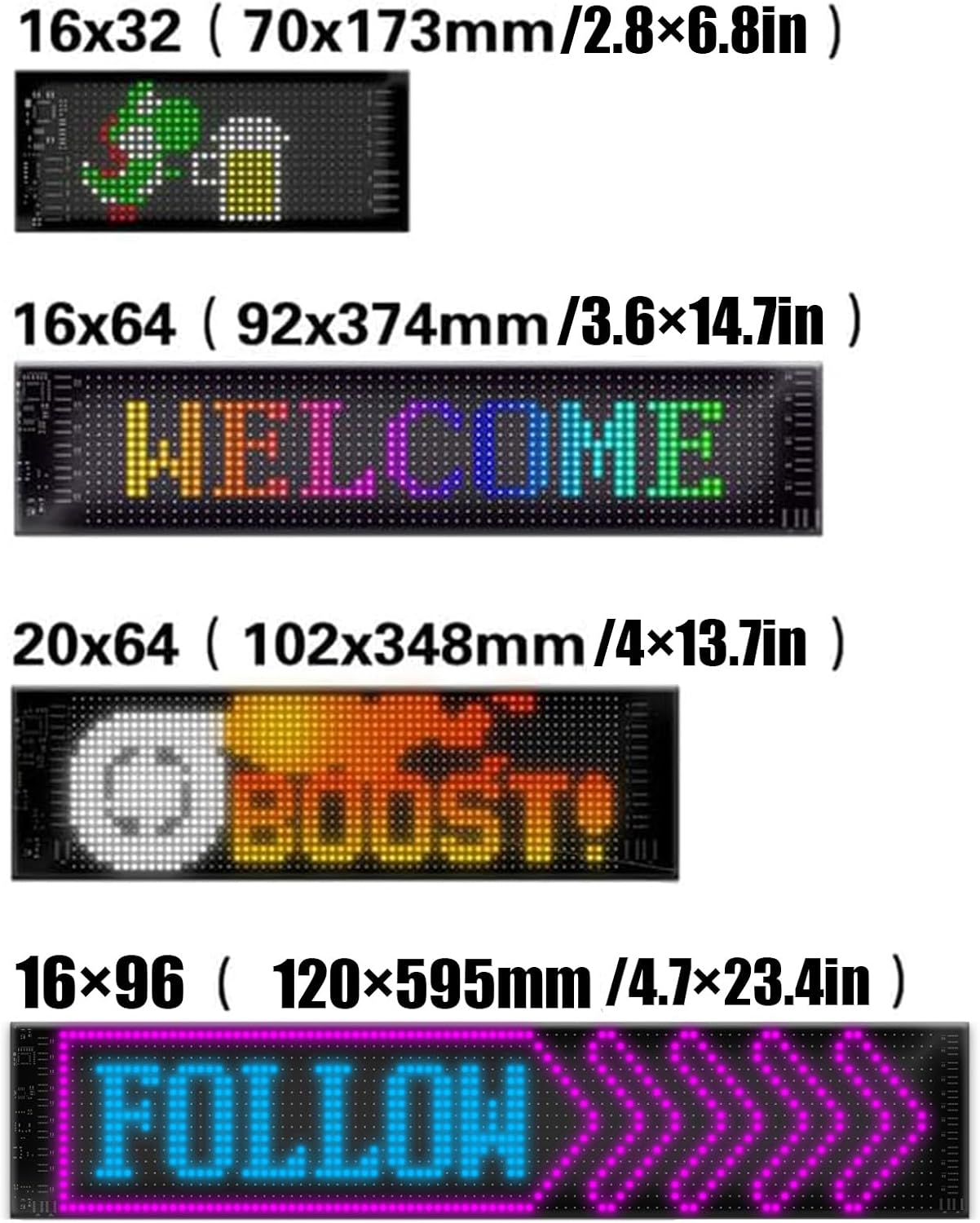 📱 Sterowanie przez aplikację – pełna kontrola w Twoim smartfonie! Wybieraj spośród gotowych wzorów lub twórz własne animacje i teksty!