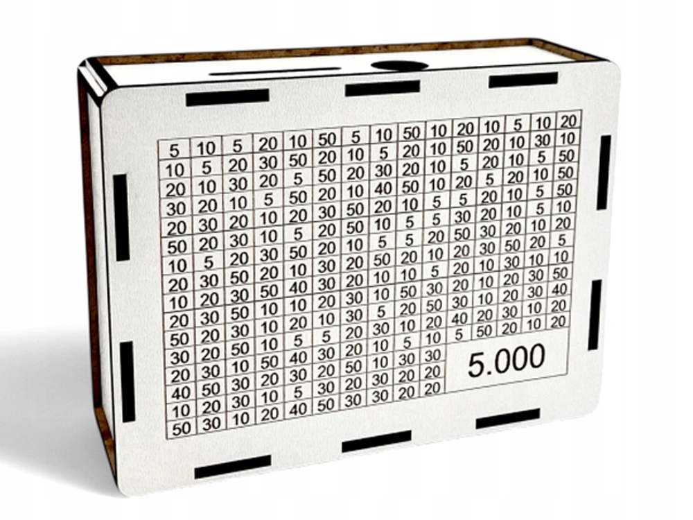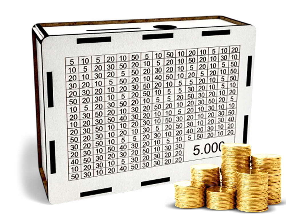 Przedstawiamy wyjątkową skarbonkę wykreślankę, która zmienia oszczędzanie w świetną zabawę i skuteczne planowanie finansowe! Dzięki kreatywnemu projektowi możesz systematycznie odkładać pieniądze na swój wymarzony cel, wykreślając kolejne kwoty na skarbonce.