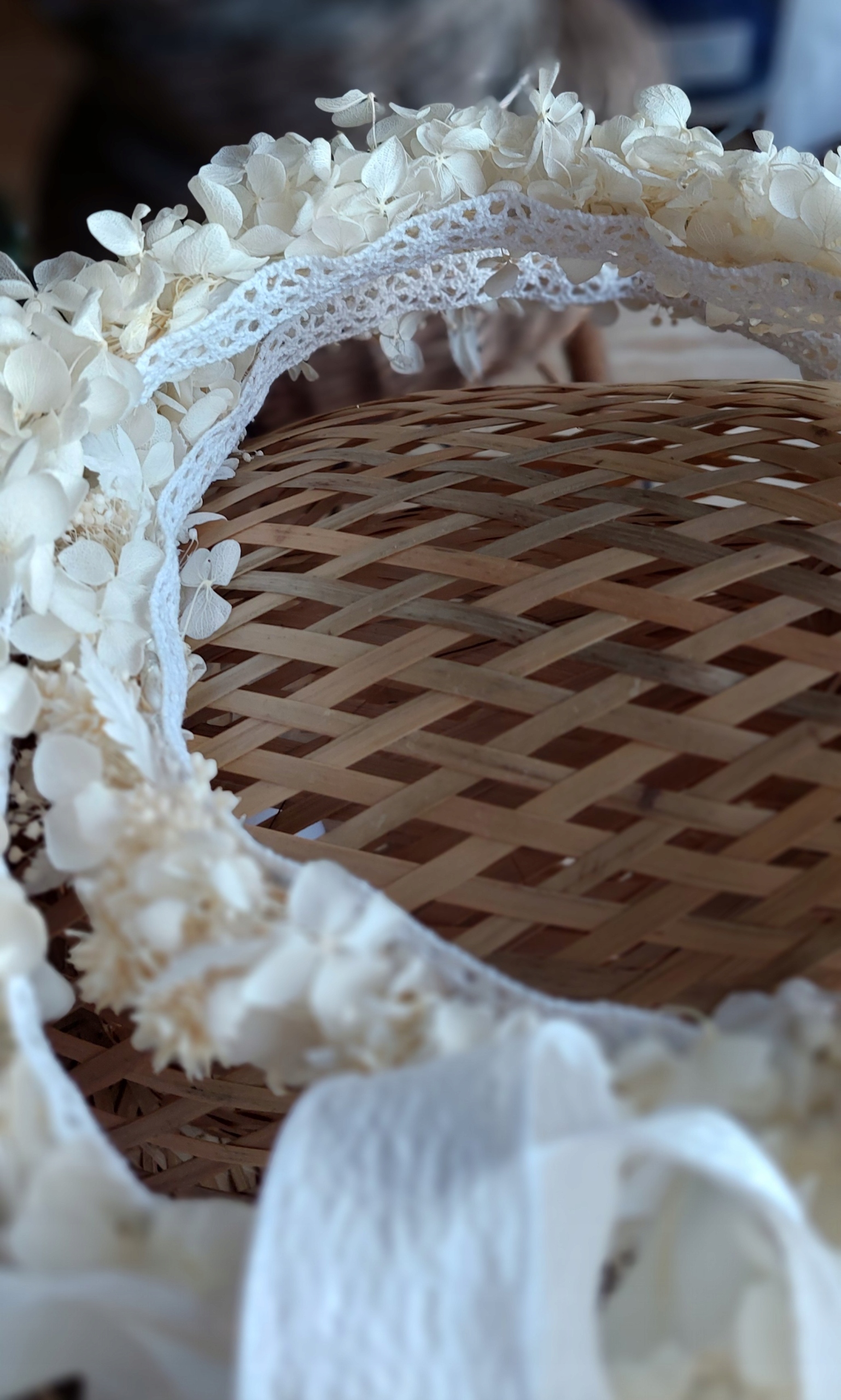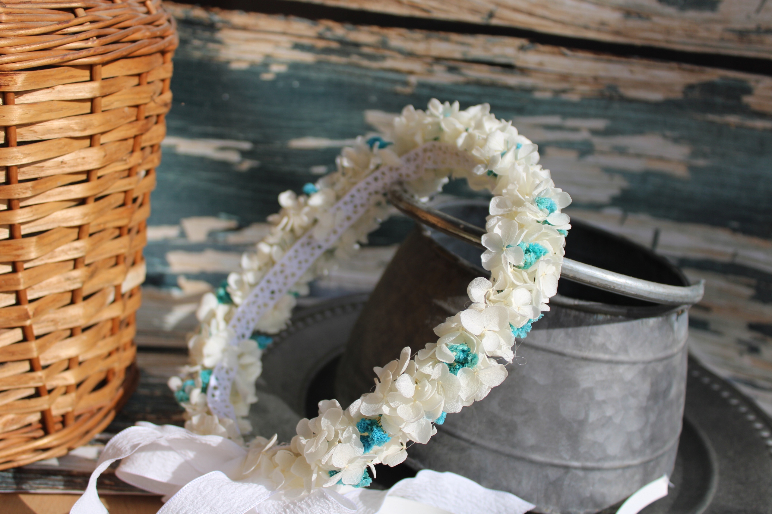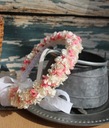 Wianek komunijny, naturalny z roślin stabilizowanych - Wysokiej jakości hortensja i gipsówka. Od środka wianka bawełniana, miękka koronka poprawiająca komfort noszenia.