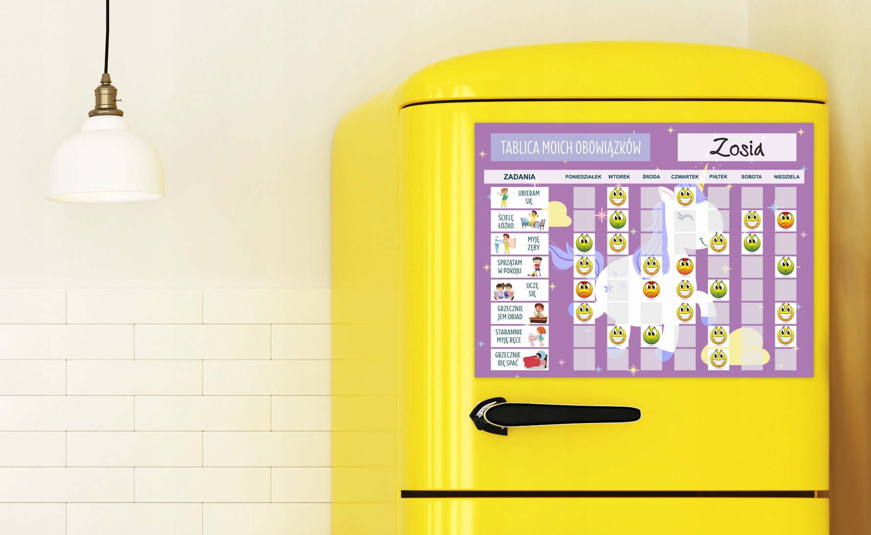 ✅ Łatwość w obsłudze – nie wymaga żadnych dodatkowych akcesoriów, baterii ani aplikacji. Wystarczy przyłożyć tablicę do lodówki, przykleić magnesy i śledzić postępy dziecka.