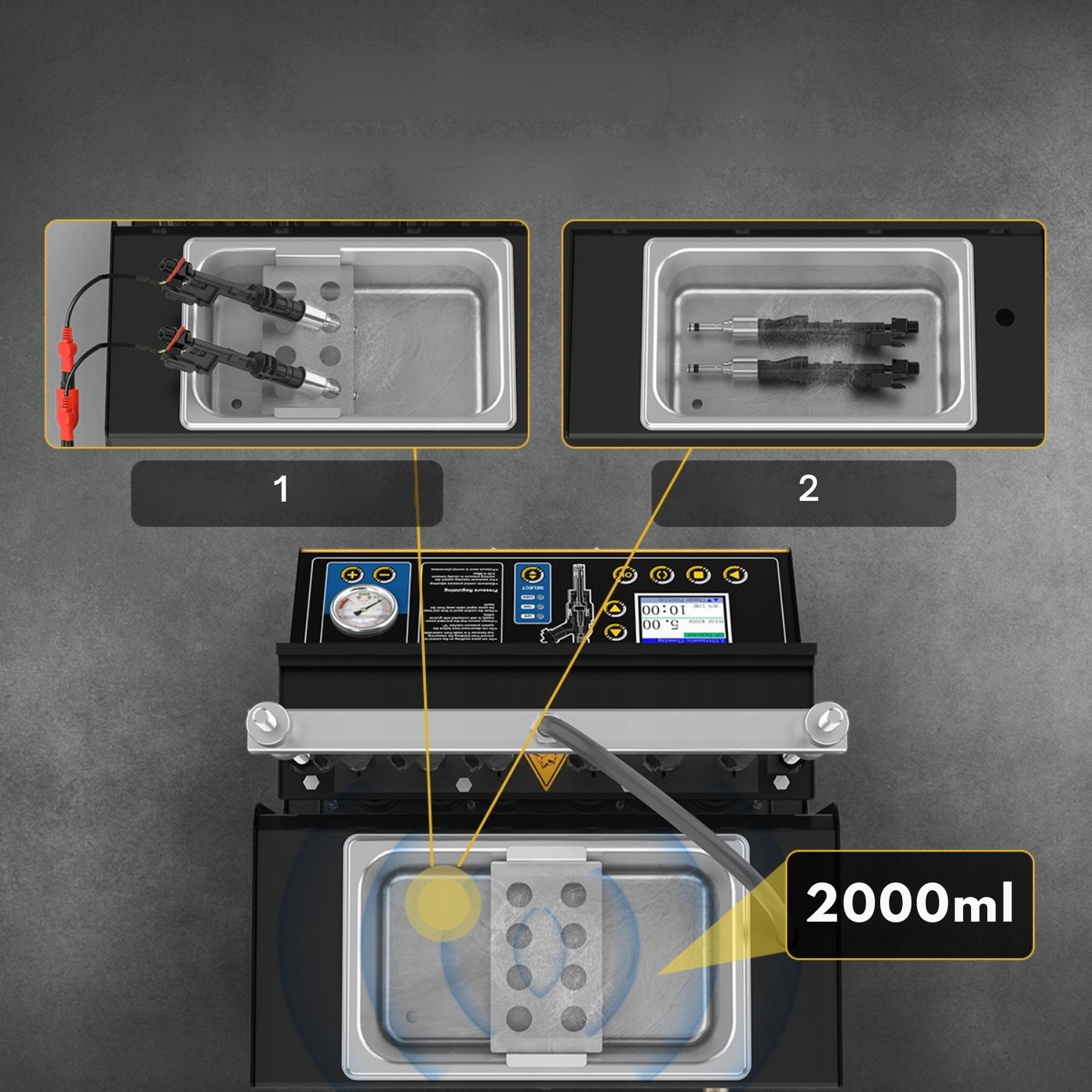 Płyn czyszczący służy do czyszczenia osadów (takich jak osady węglowe) na wtryskiwaczach paliwa i zwykle jest wysoce żrący i łatwopalny. W celu uzyskania najlepszego efektu testu zaleca się stosowanie profesjonalnego płynu do ultradźwiękowego czyszczenia wtryskiwaczy. Jeśli nie jest dostępny lokalnie, zaleca się użycie alkoholu medycznego o zawartości alkoholu powyżej 75% zamiast płynu czyszczącego, ale pamiętaj, że efekt może nie być wystarczająco dobry
