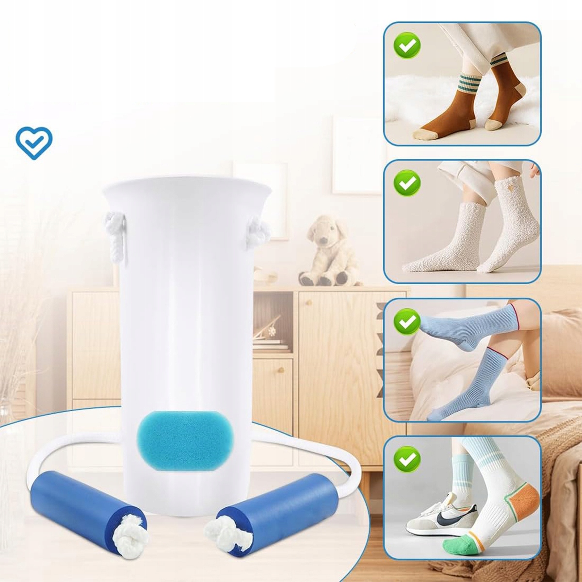 Przyrząd do zakładania pończoch nie jest przeznaczony do stosowania razem z pończochami uciskowymi. Zalecane rodzaje skarpetek: skarpetki do kostki, skarpetki płaskie, podkolanówki, skarpetki do łydek, skarpetki sportowe, skarpetki wizytowe itp. Odpowiednie dla stóp o szerokości 10,9 cm lub mniejszej.