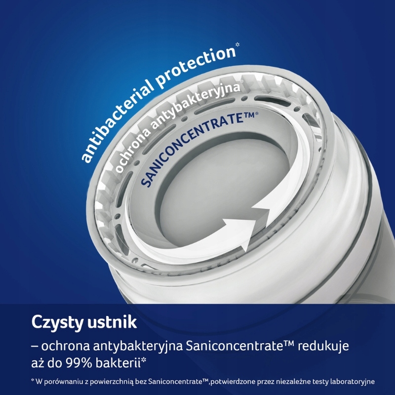 Dzięki technologii Saniconcentrate™ ustnik redukuje do 99% bakterii*, co potwierdziły niezależne testy.