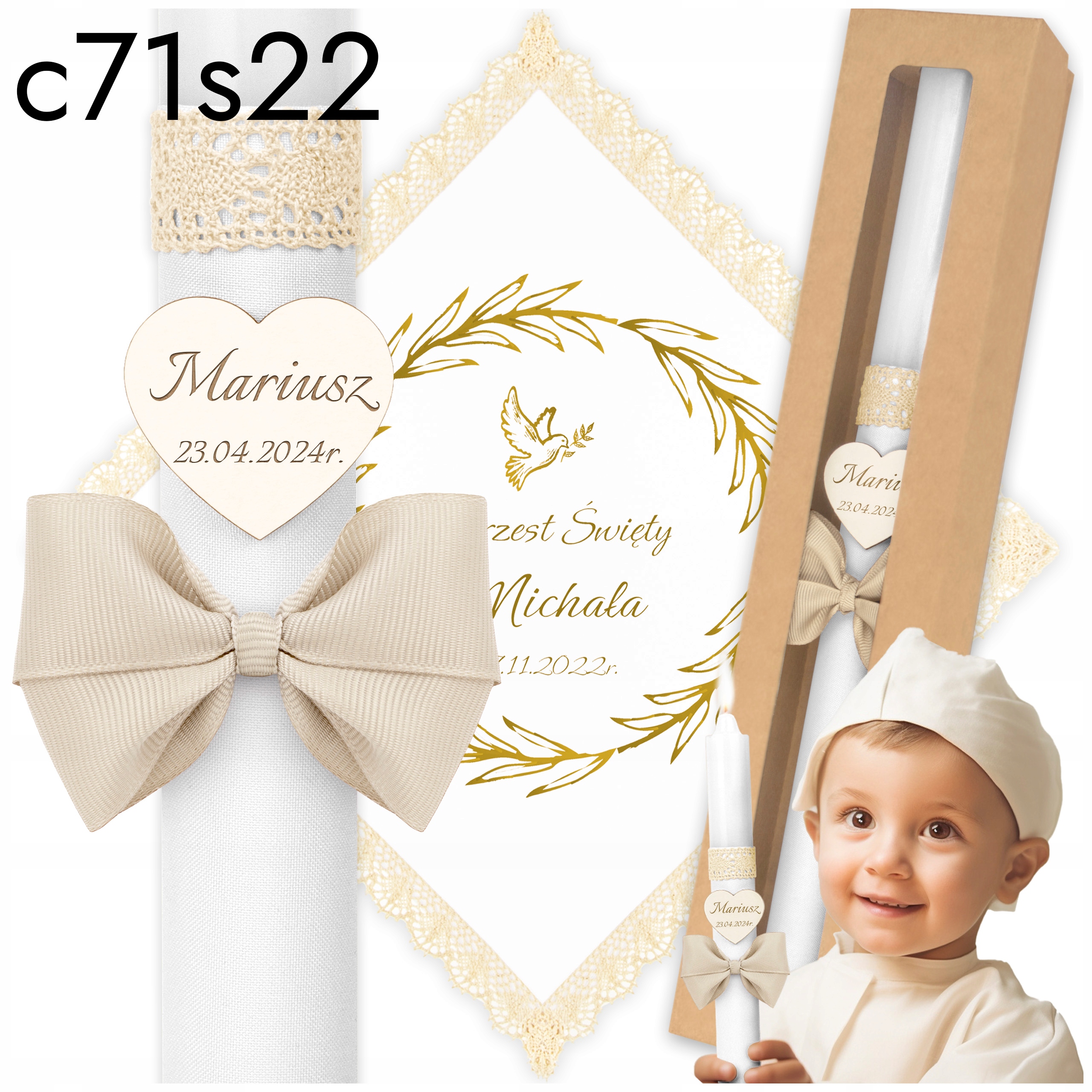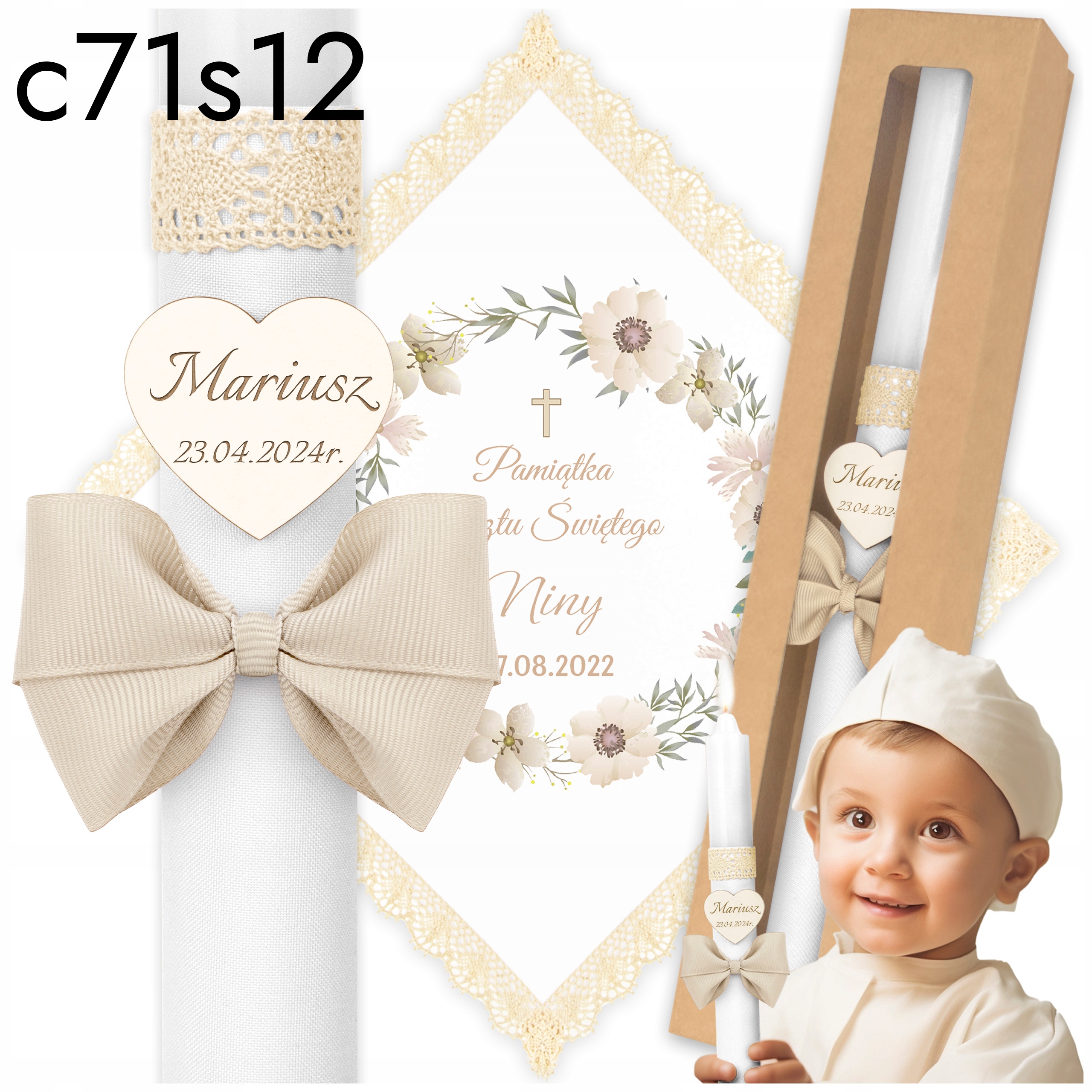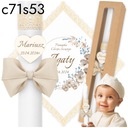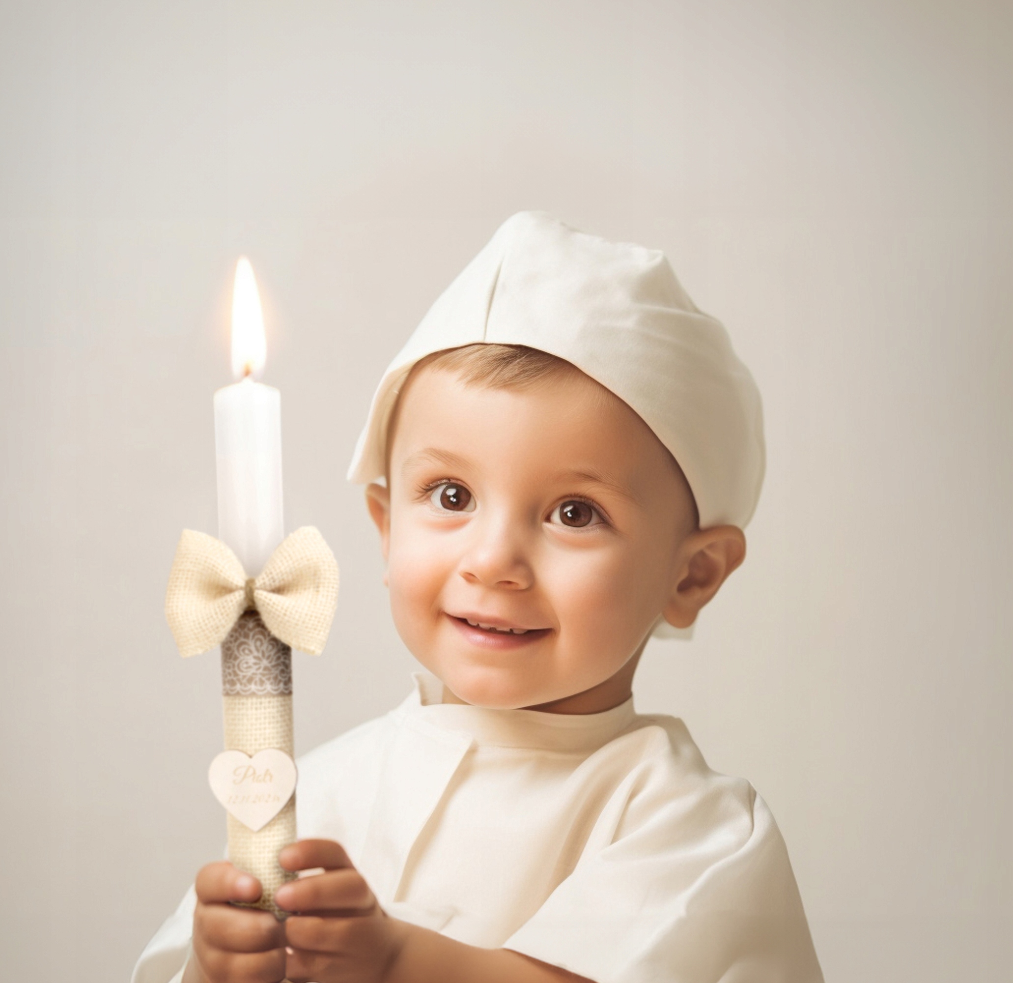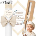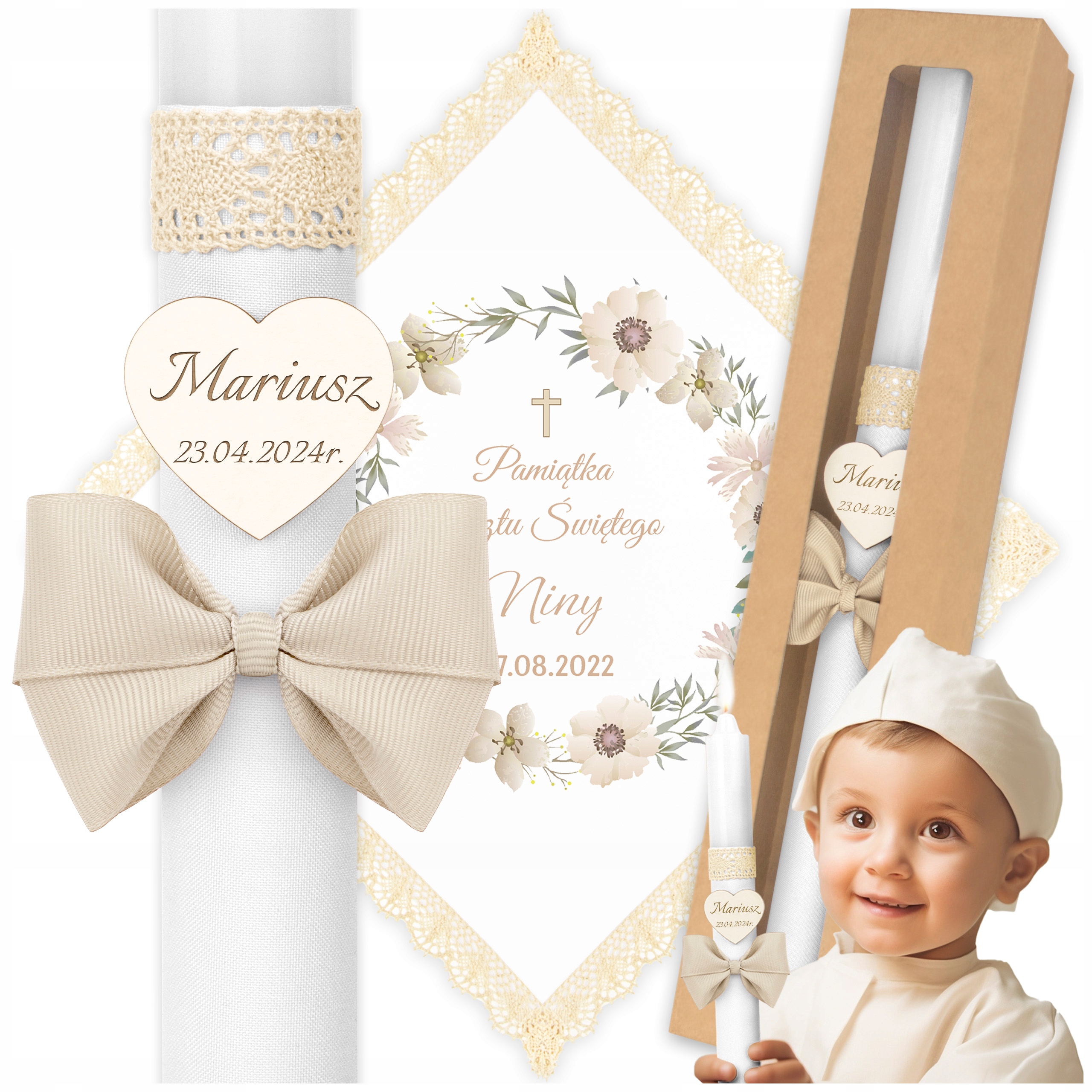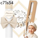 Oferujemy niezwykłą Pamiątkę Chrztu Świętego. Nasza świeca do Chrztu w stylu boho to wyjątkowy dodatek, który wniesie ciepło i wyjątkowy urok do tego ważnego dnia. Oferta zawiera zarówno świecę, białą, zdobioną szatkę do chrztu oraz pudełko na świecę, wszystko stworzone z dbałością o każdy szczegół.
